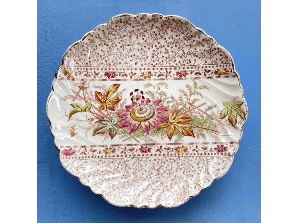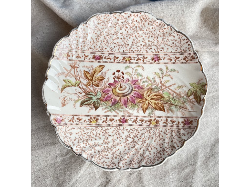 Nástolec působí dojmem starší anglické fajánse a zdobí jej bohatý botanický motiv v teplých odstínech růžové, hnědé a zelené.