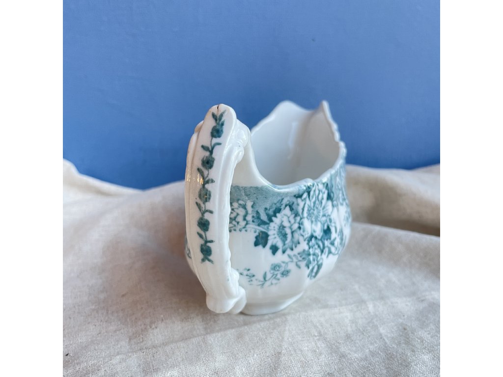 Povrch zdobí jemný zelený transferový tisk s bohatým florálním a rokajovým dekorem, typickým pro pozdně viktoriánské období.