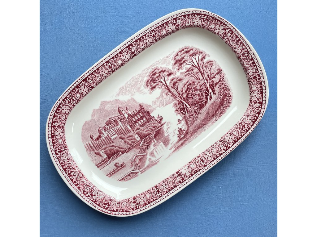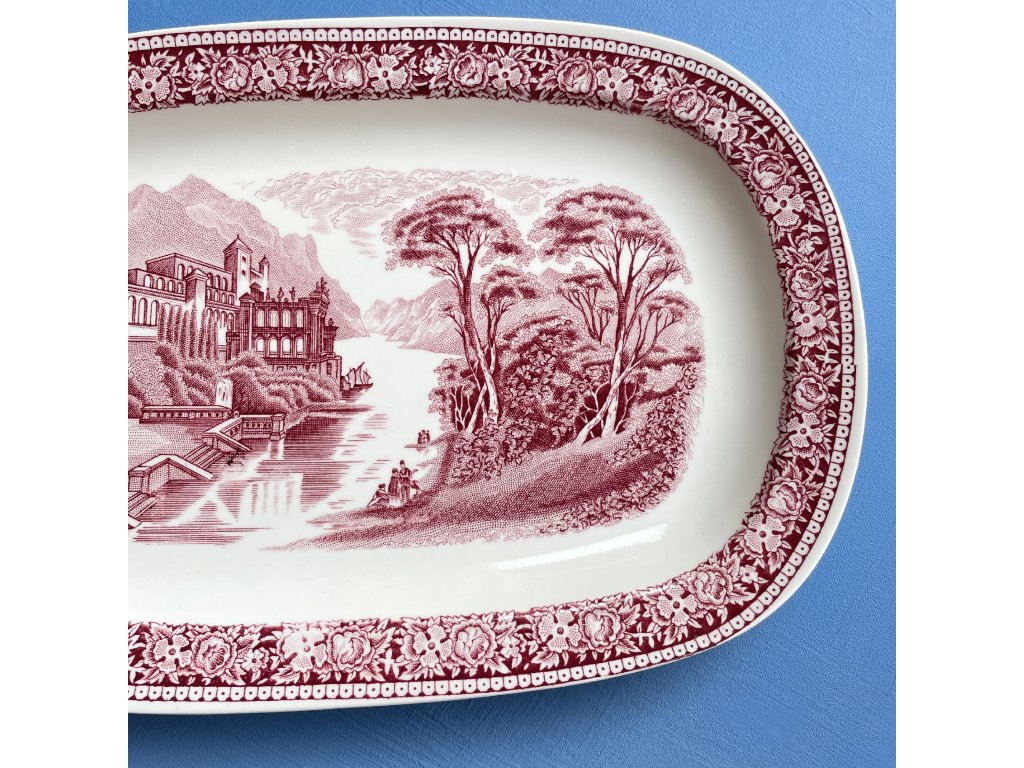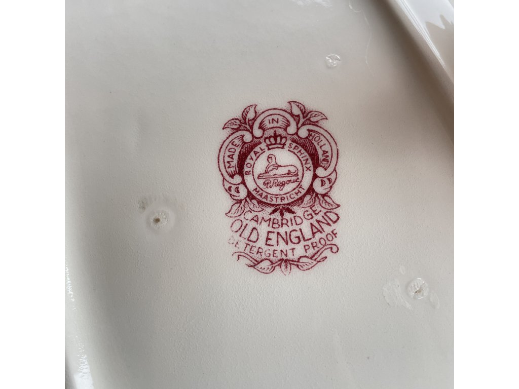 Je vyroben v klasickém anglickém transferovém stylu, který byl pro tuto továrnu typický v první polovině 20. století, a proveden v sytě vínově červené barvě na krémově bílém podkladu.