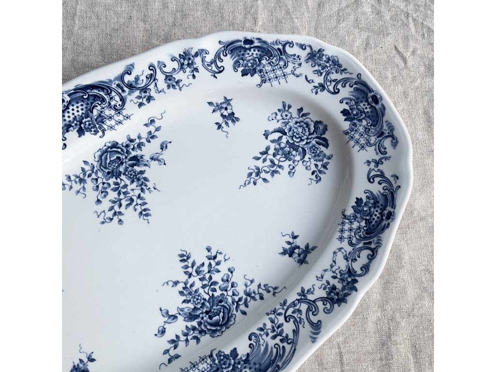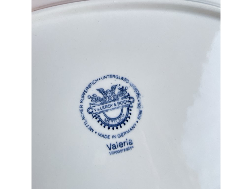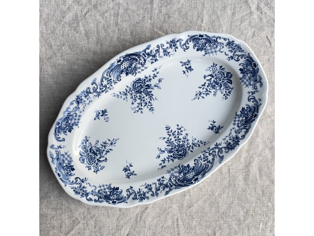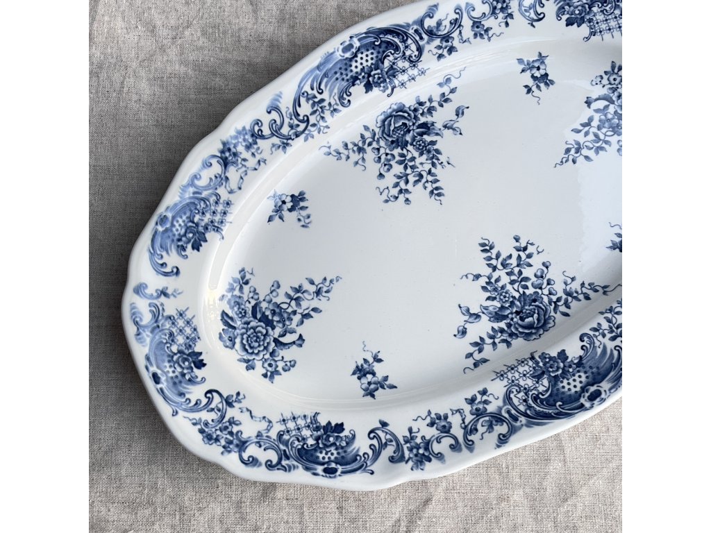 Oválný porcelánový podnos z řady Valeria od německé značky Villeroy & Boch představuje krásný příklad klasického stolního porcelánu s podglazurovým dekorem.