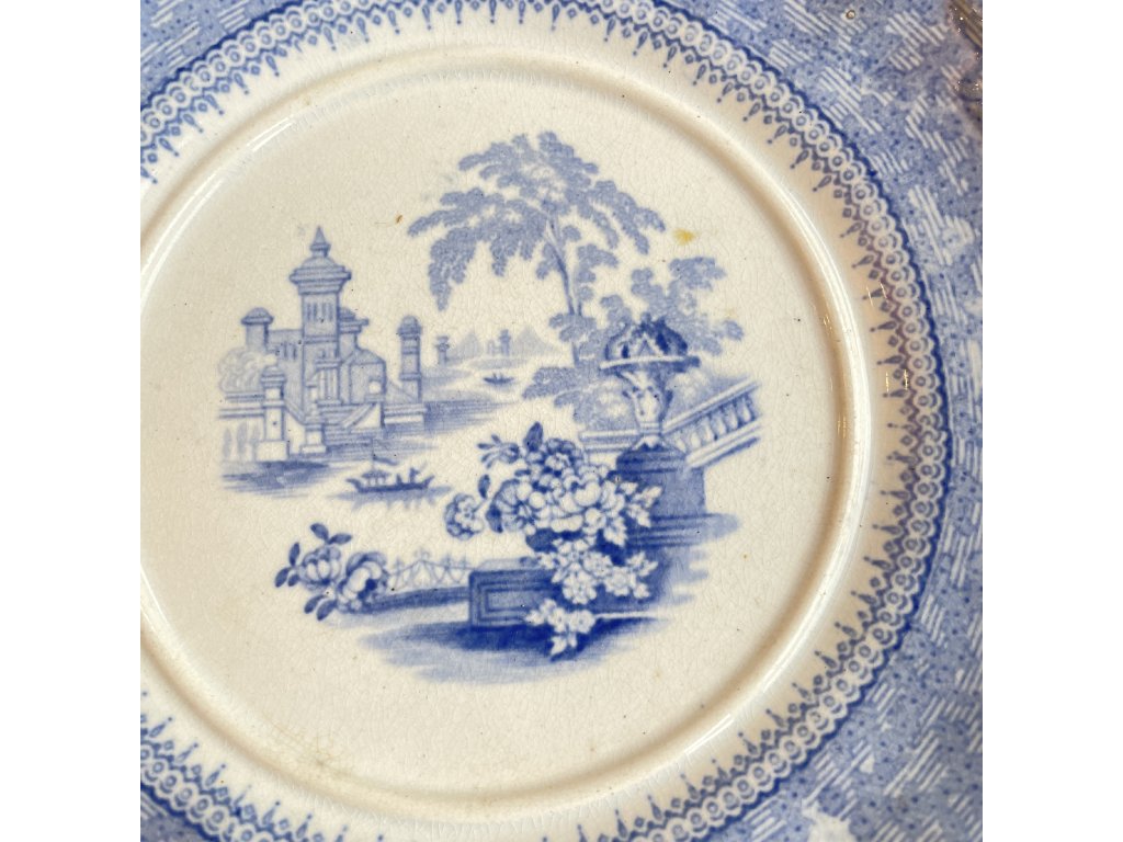 Podnos je zdobený jemným přenosovým tiskem v bledě modré barvě, který zobrazuje romantickou krajinu s architekturou, stromy a květinami v popředí – oblíbený motiv anglického transferware.