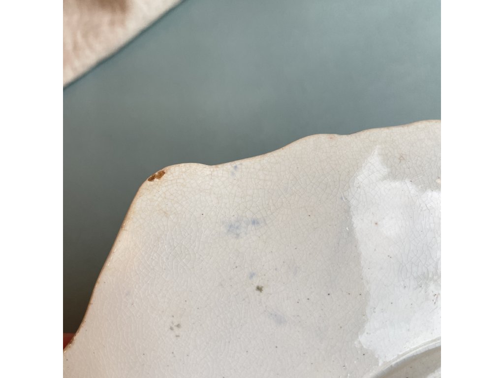 Podnos s uchy pochází z anglické výroby a je vyroben z tzv. ironstone china – druhu tvrdé kameniny, která byla oblíbená pro svou pevnost a trvanlivost.