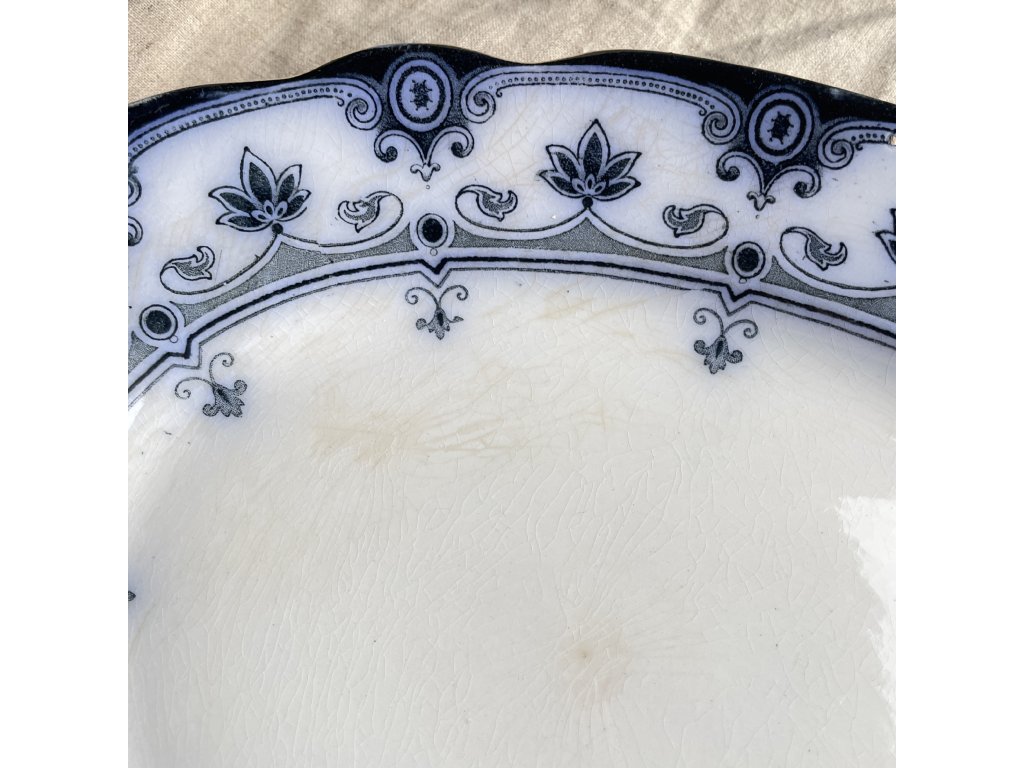 Podnos je vyroben z glazované kameniny a zdoben technikou přenosového tisku v klasické kobaltově modré barvě.