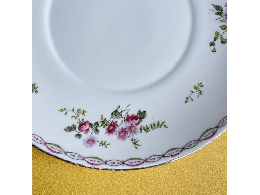 Po obvodu je veden dekorativní pás tvořený stylizovaným proplétaným motivem v růžové a zelené barvě, doplněný drobnými tečkami.