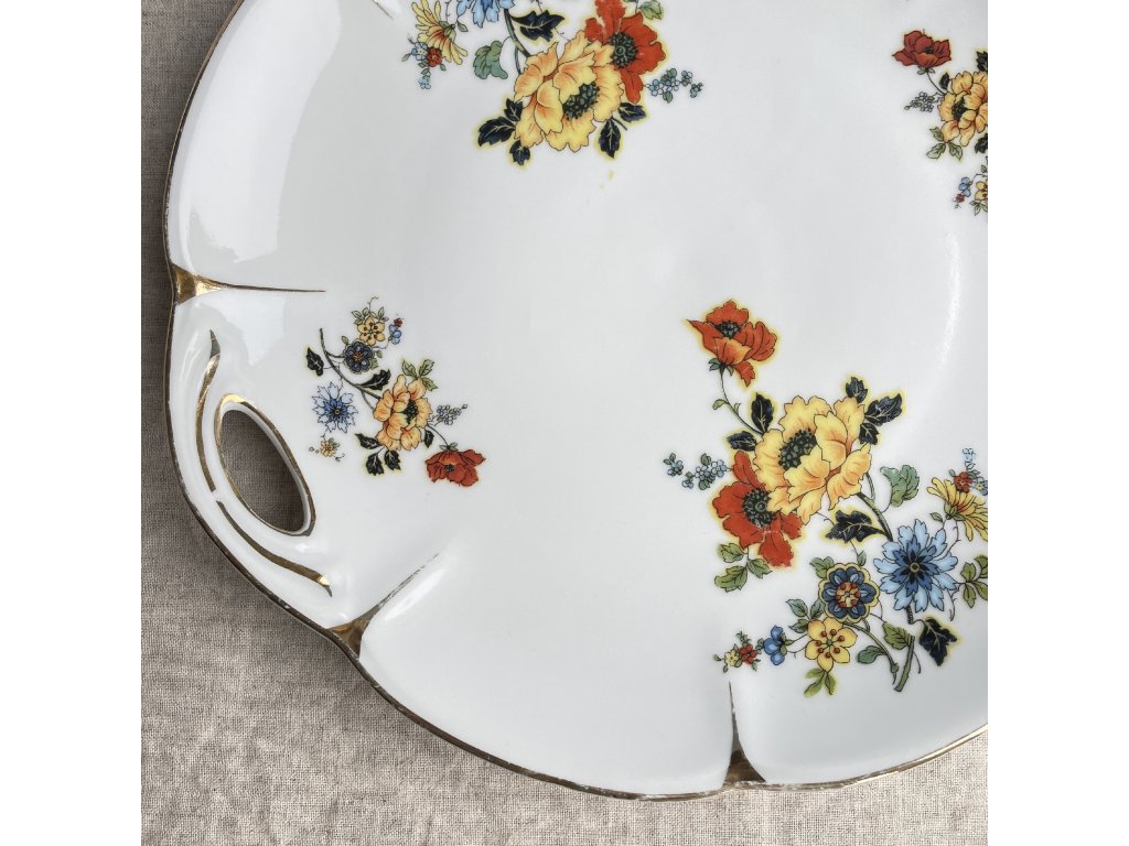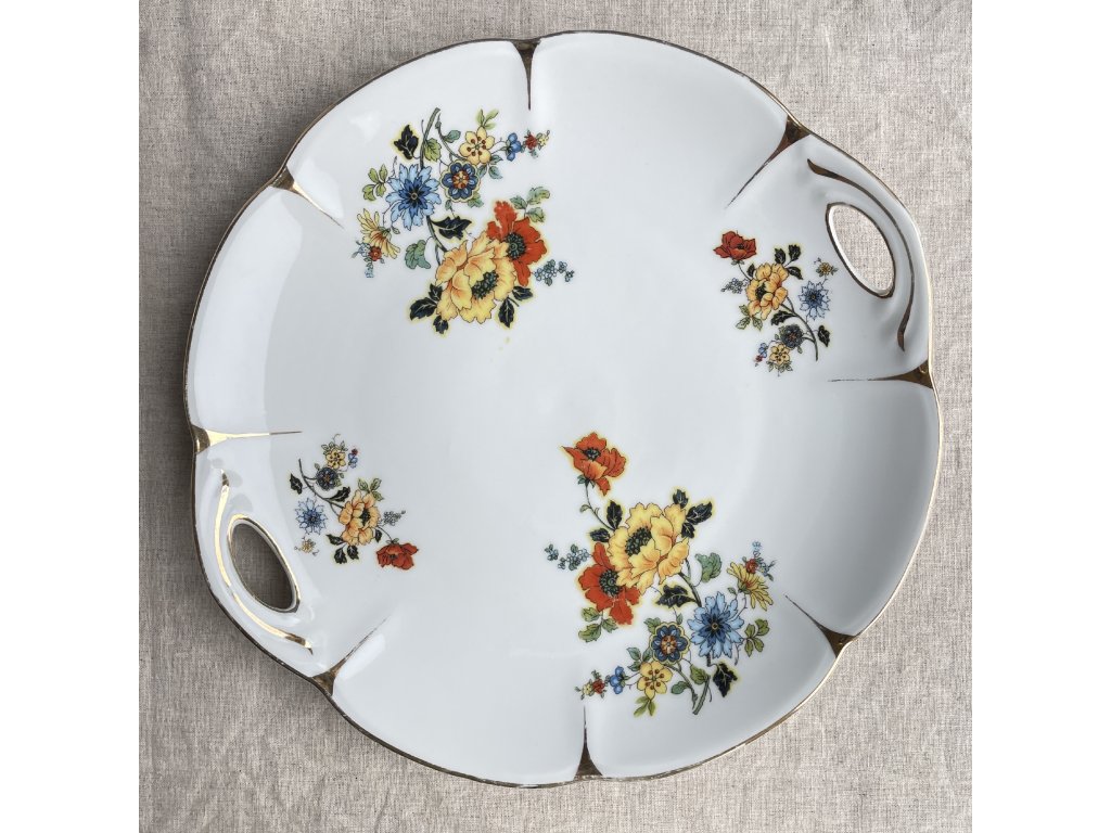 Okraje podnosu jsou lehce zvlněné, členěné do šesti dílů, zakončené zlatými akcenty, které dodávají celku eleganci.