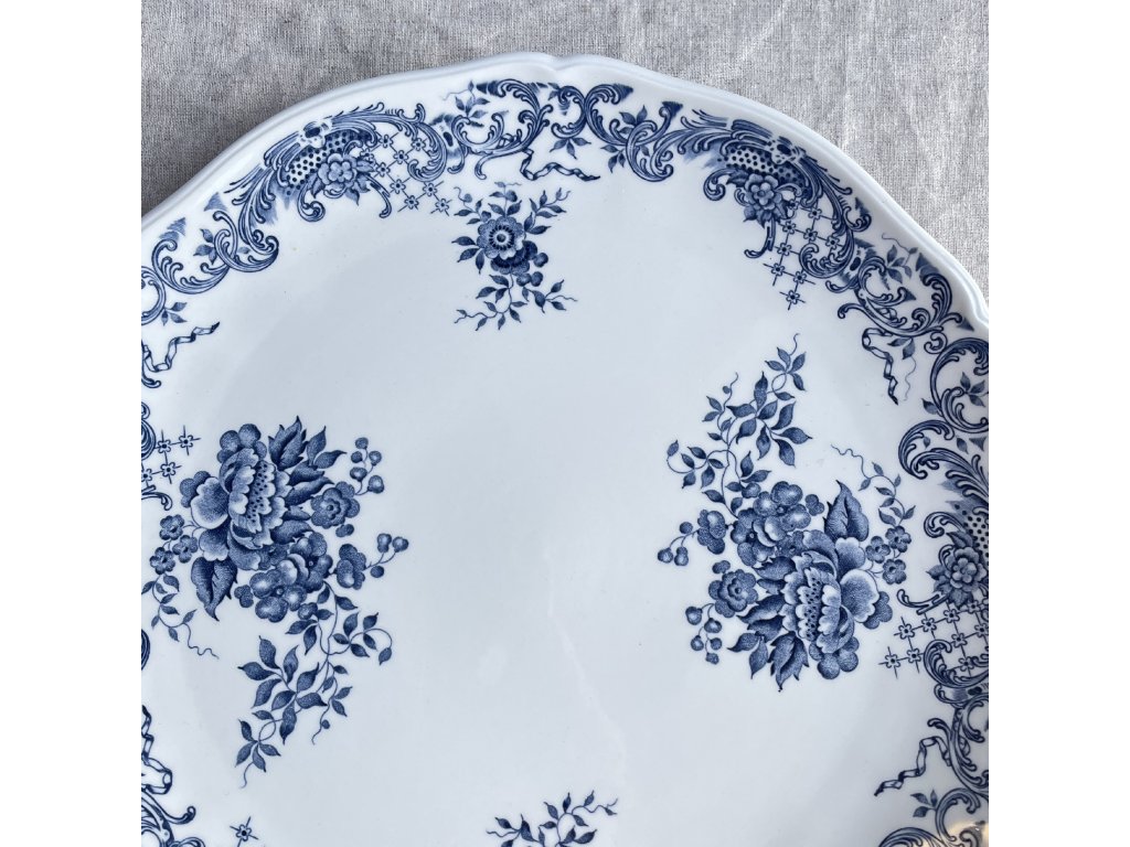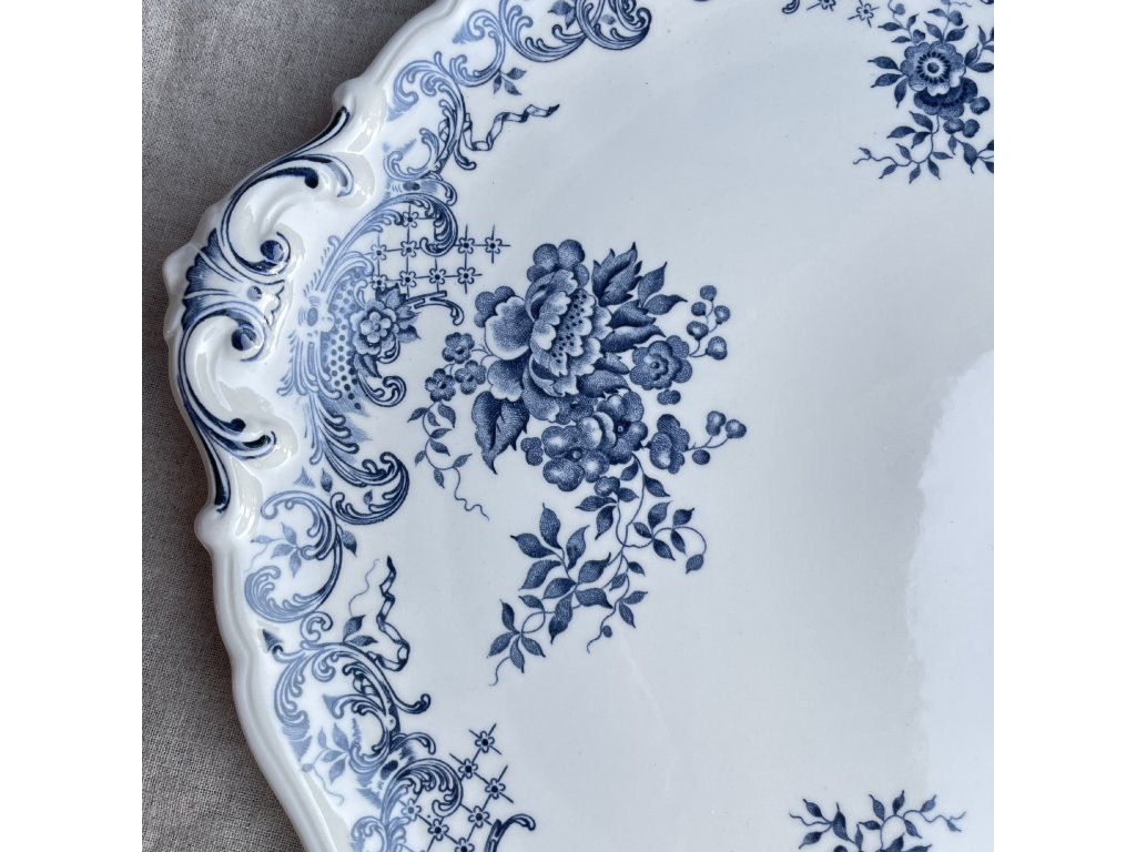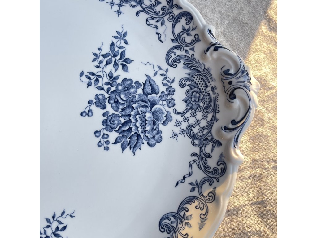 Dekor je proveden v jemné kobaltově modré barvě, typické pro tradiční porcelán, a tvoří jej stylizované květinové motivy v kombinaci s ornamentálními vzory.