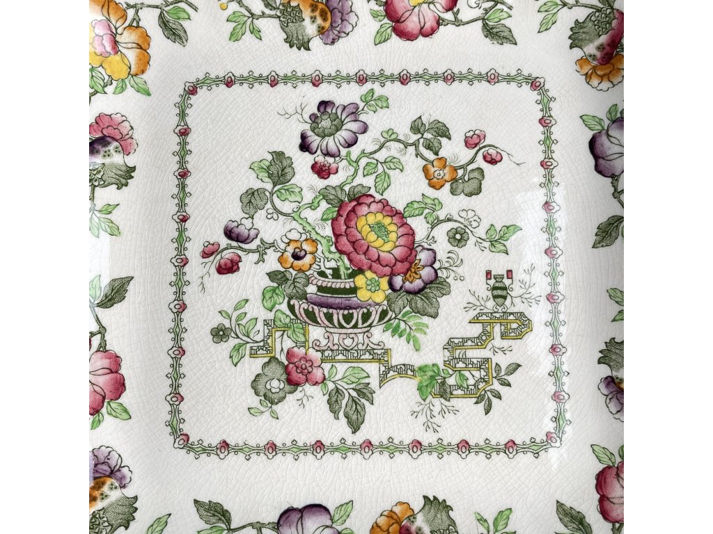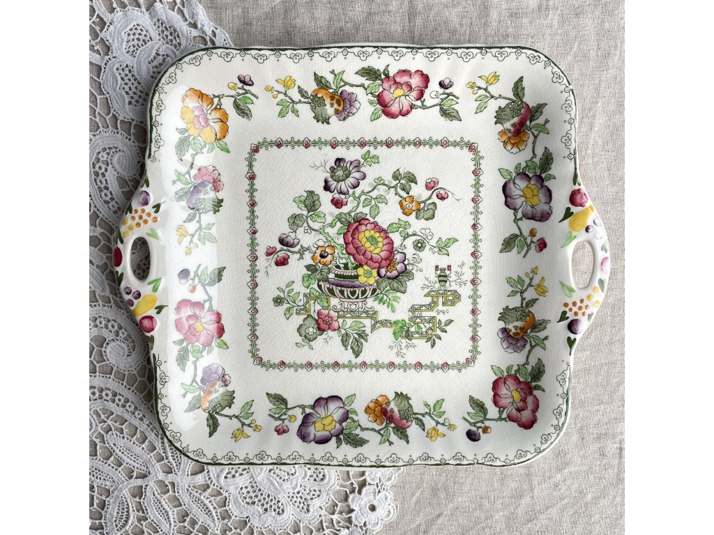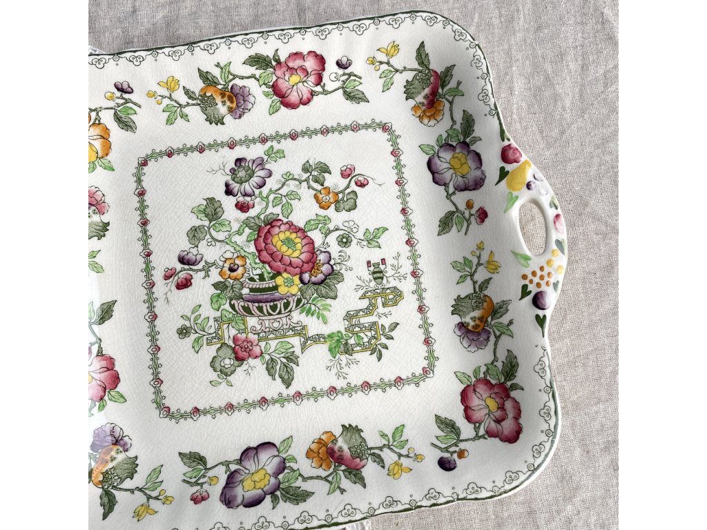 Obdélníkový podnos s uchy je vyroben z anglického ironstonu a zdoben bohatým polychromním květinovým dekorem ve stylu chinoiserie.