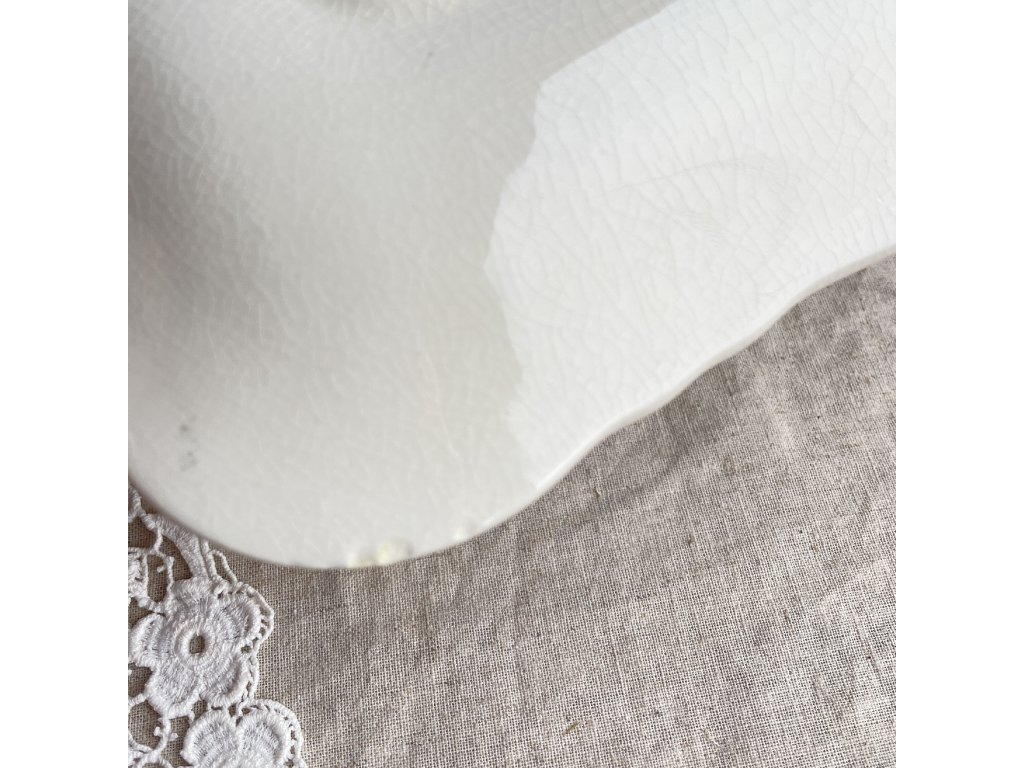 Povrch je kryt světlou krakelovanou a lehce zabarvenou glazurou, typickou pro ironstone, která podnosu dodává měkký, lehce patinovaný vzhled a podtrhuje jeho stáří a autenticitu.