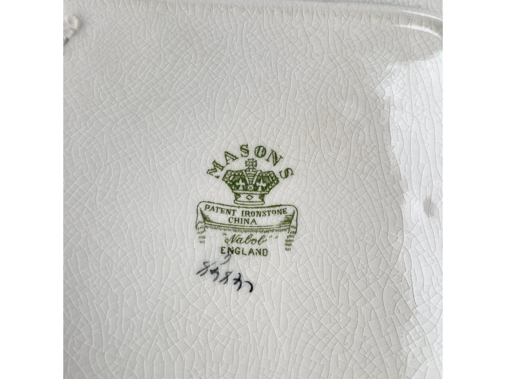 Značka Mason’s s korunou a nápisem „Patent Ironstone China, Nabob, England“, která podnos zařazuje do produkce firmy Mason’s z 19. století, konkrétně k oblíbenému vzoru Nabob.