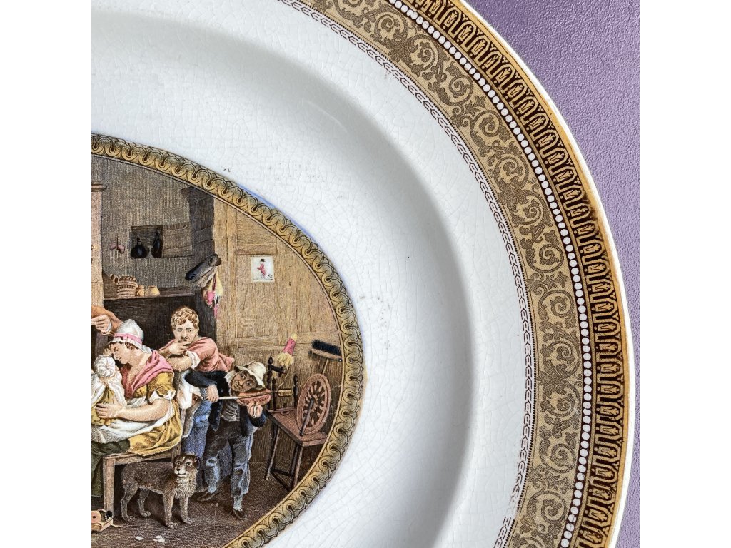 Uprostřed podnosu je oválná scéna odehrávající se v rustikálním interiéru – slepý houslista hraje pro rodinu, která ho s dojetím poslouchá, děti se shlukují kolem, matka chová dítě a pes sleduje dění u jejich nohou.
