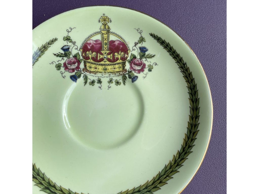 Podšálek je zdoben výrazným centrálním motivem královské koruny, obklopené růžemi, bodláky, jetelovými lístky a lnem – symboly čtyř částí Spojeného království (Anglie, Skotska, Irska a Walesu).