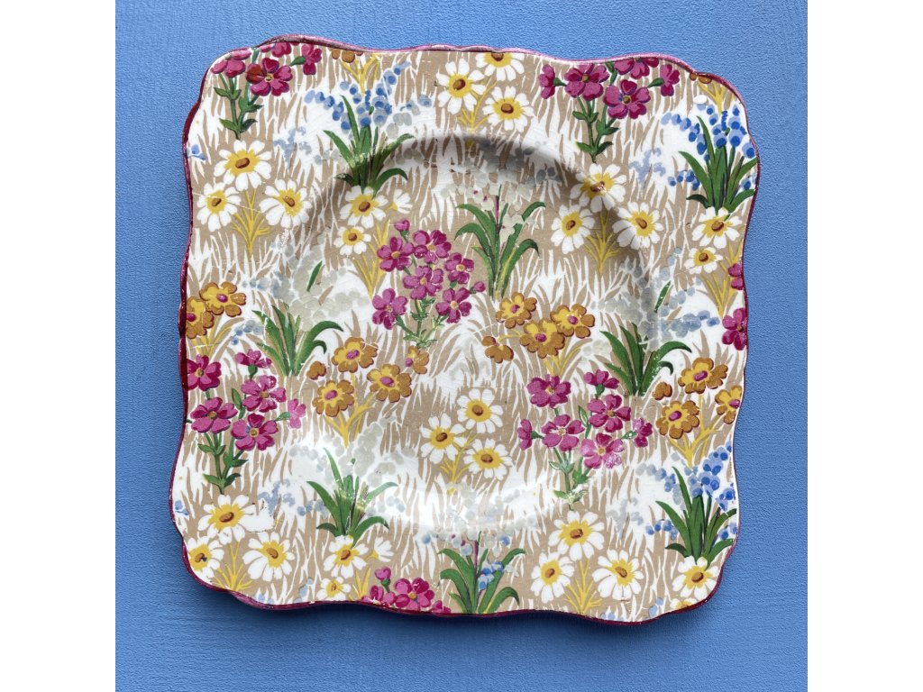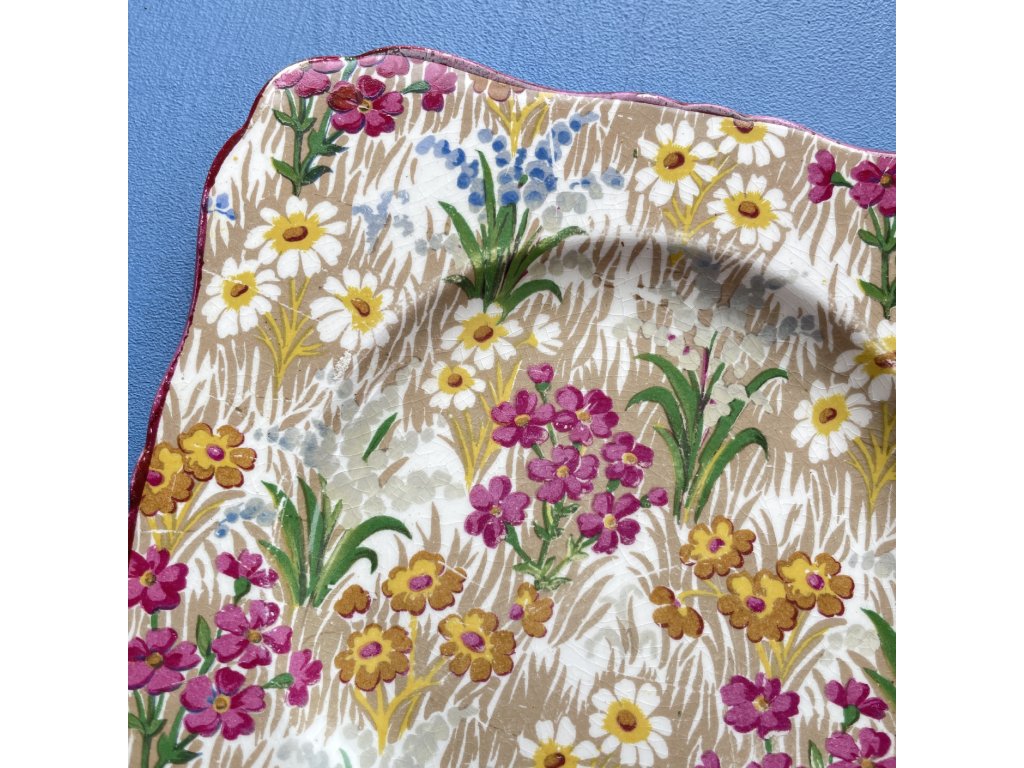 Dekor tvoří stylizované kopretiny, drobné růžové a žluté květy a zelené listy, doplněné o hnědavý rastrový podklad, který celku dodává živost a dekorativní hloubku.
