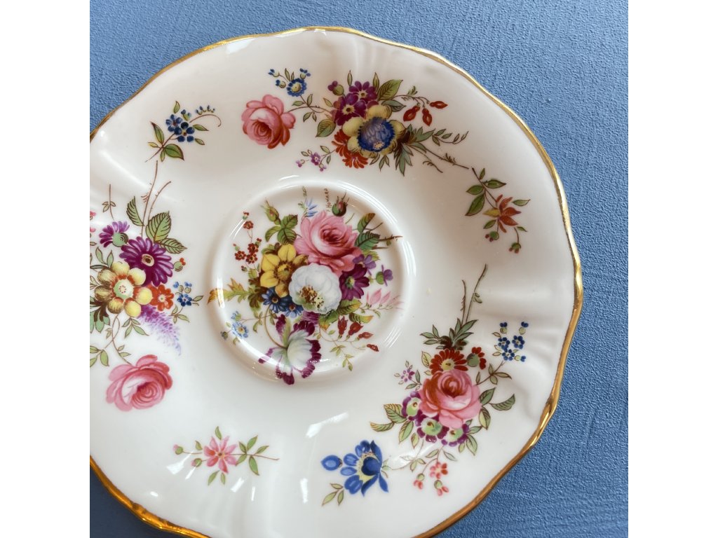 Ve středu podšálku se nachází výrazný květinový medailon, který harmonicky doplňuje dekor na okraji.