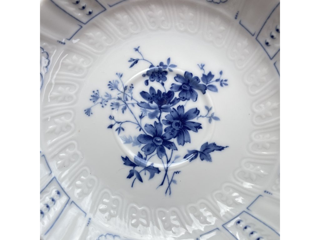 Ve středové části se nachází jemná květinová kytice provedená v různých odstínech kobaltové modři, s pečlivě vykreslenými květy a drobnými lístky, které působí lehce a vyváženě.