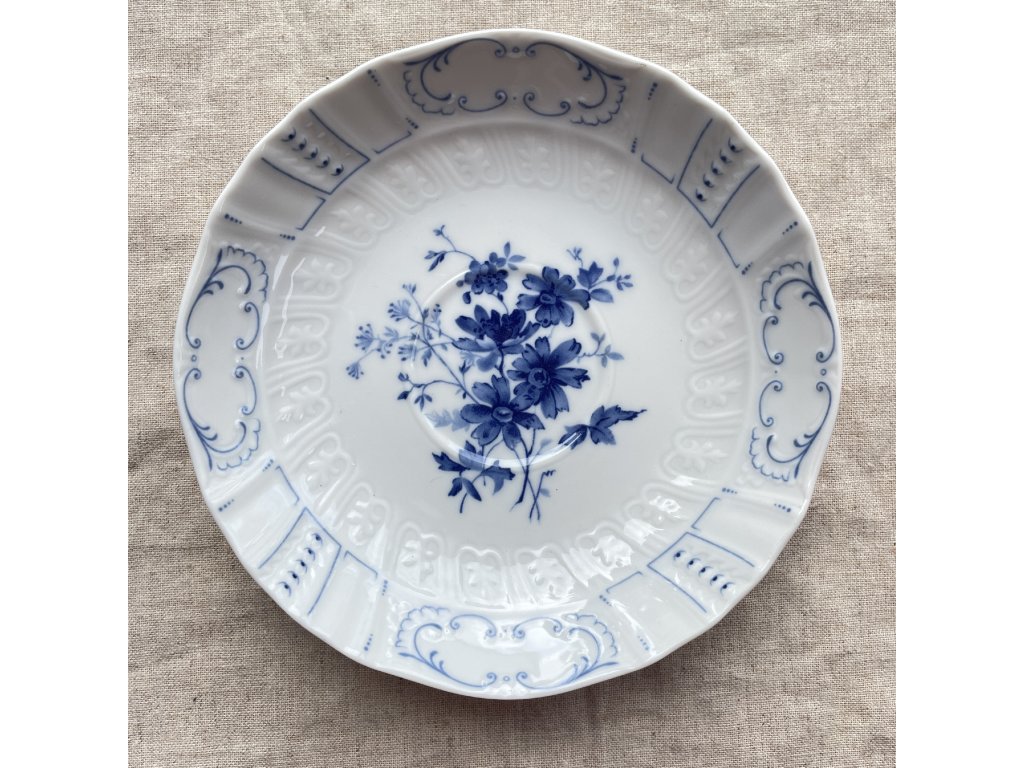 Podšálek je vyroben z jemného bílého porcelánu a zdoben decentním modrobílým dekorem v klasicizujícím duchu.