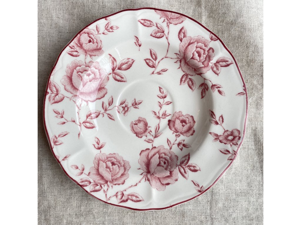 Podšálek je zdoben jemným květinovým dekorem s motivem rozvitých růží a drobných lístků v odstínech starorůžové až vínové, které jsou nepravidelně rozloženy po celé ploše.