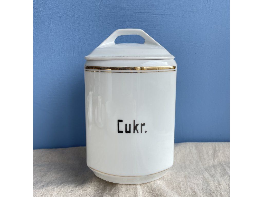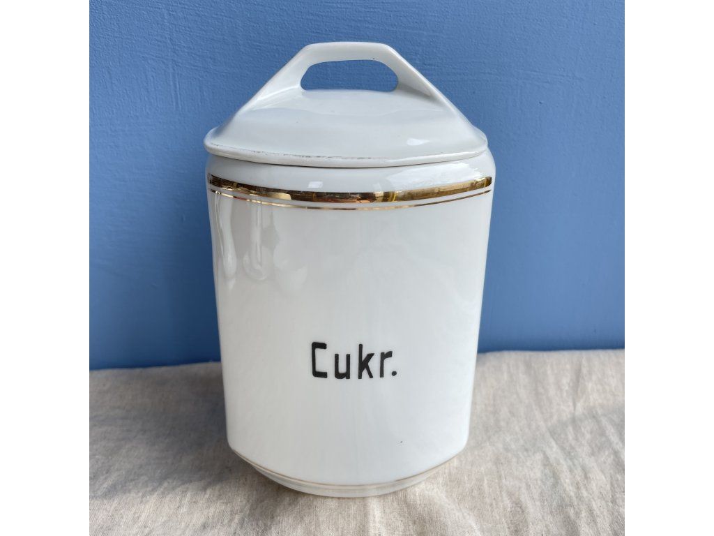 Na přední straně je černý nápis „Cukr.“, typický pro starší domácí dózy, které byly určeny k přehlednému uchovávání základních surovin.