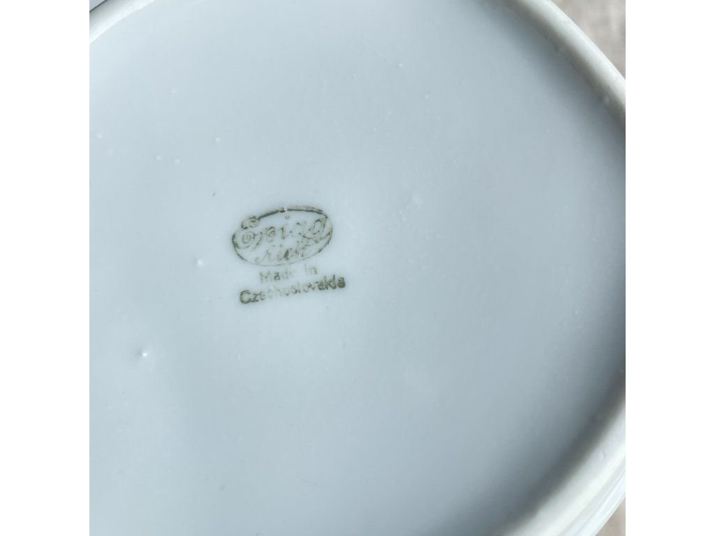 Povrch je hladký, v bílé glazuře, doplněný jemnou zlatou linkou pod okrajem, která dodává jinak strohému provedení lehce elegantní akcent.