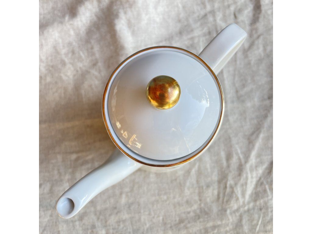 Konvice je doplněna víčkem s kulatým úchytem zdobeným zlatou barvou, stejně jako tenká zlatá linka lemující horní okraj, což jí dodává jemný, klasický vzhled.