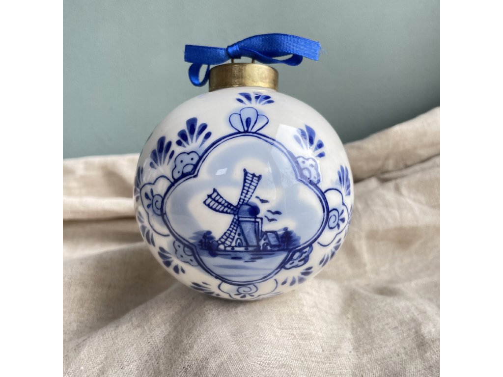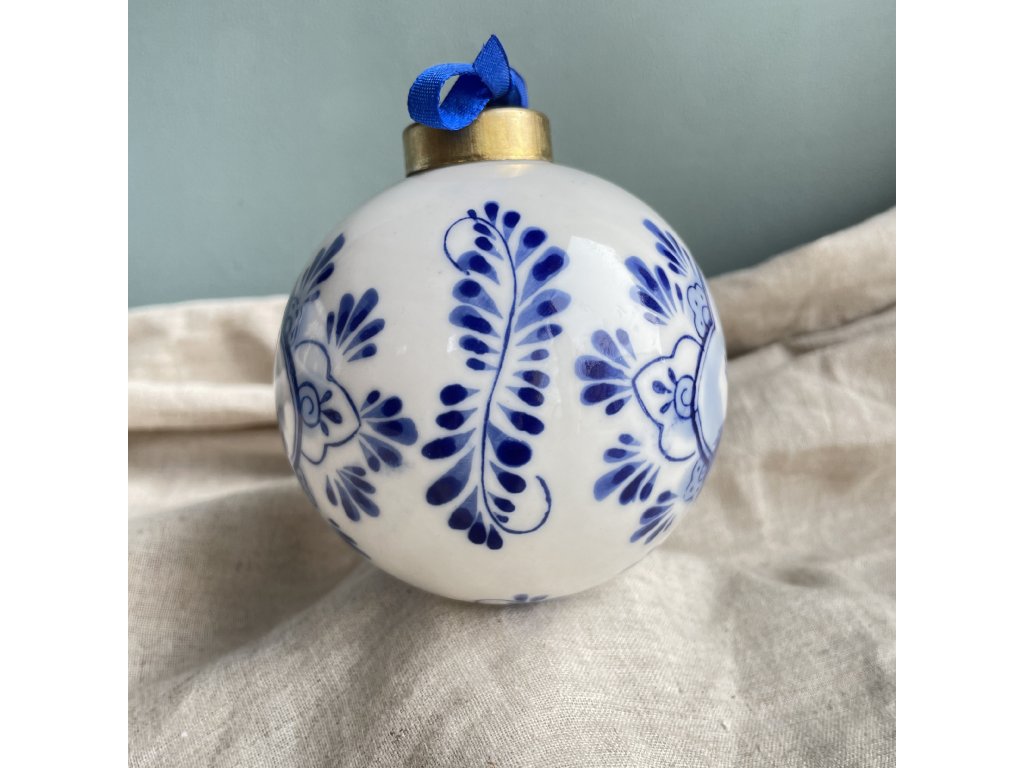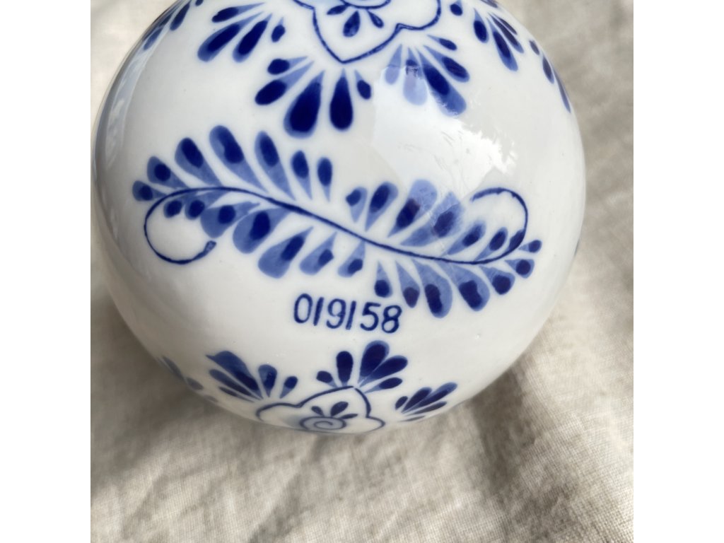 Porcelánová koule představuje krásnou ukázku tradiční nizozemské keramické dekorace, známé jako „Delfts Blauw“ (Delftská modř).