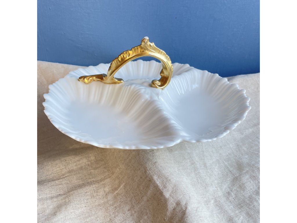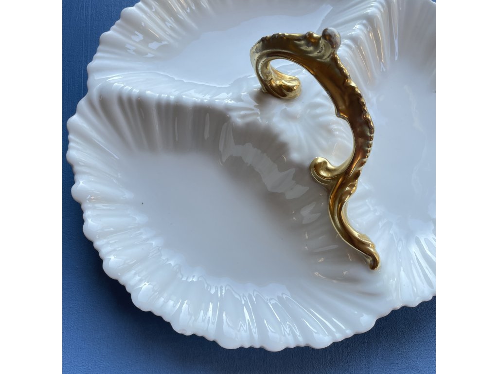 Střed misky korunuje výrazný úchyt ve zlacené úpravě ve stylu rokoka – bohatě tvarované, s plastickými detaily listů a volut, které dotvářejí dojem luxusu.
