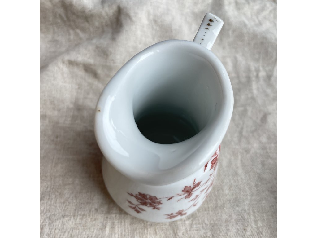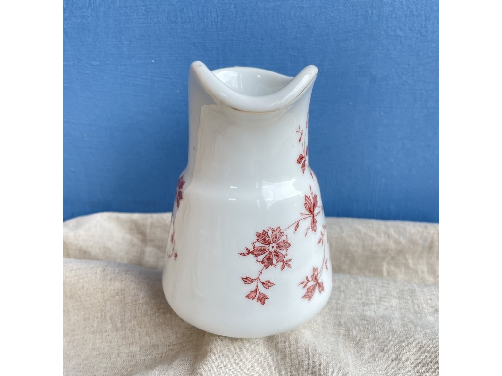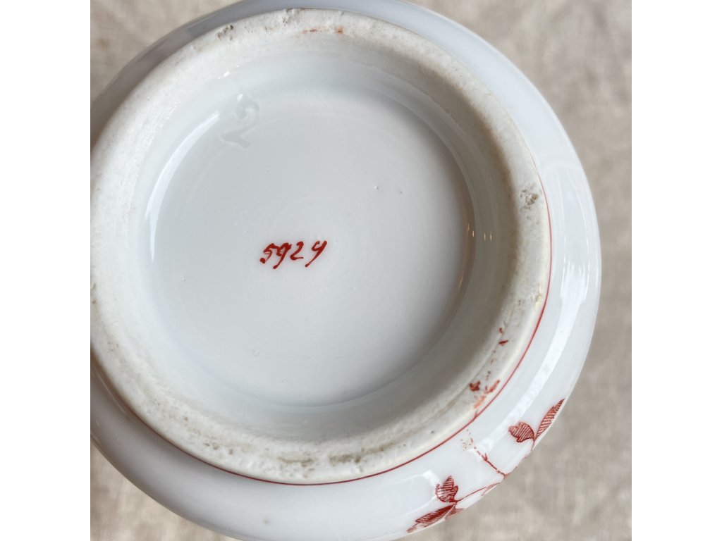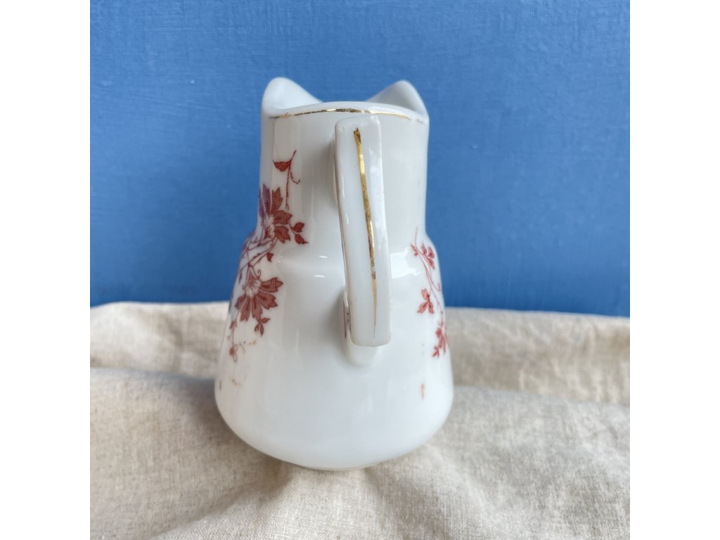 Bílý základ je zdoben decentním červeným květinovým dekorem s rostlinnými úponky, typickým pro přelom 19. a 20. století.
