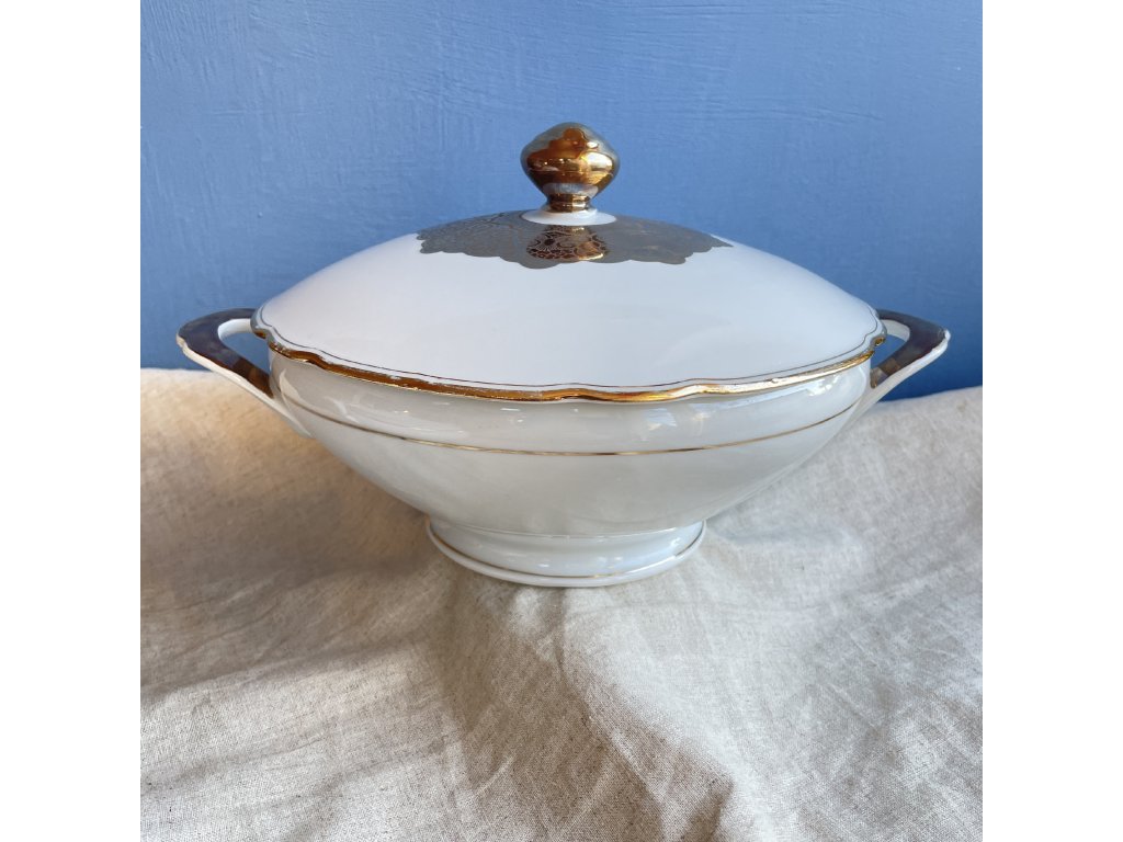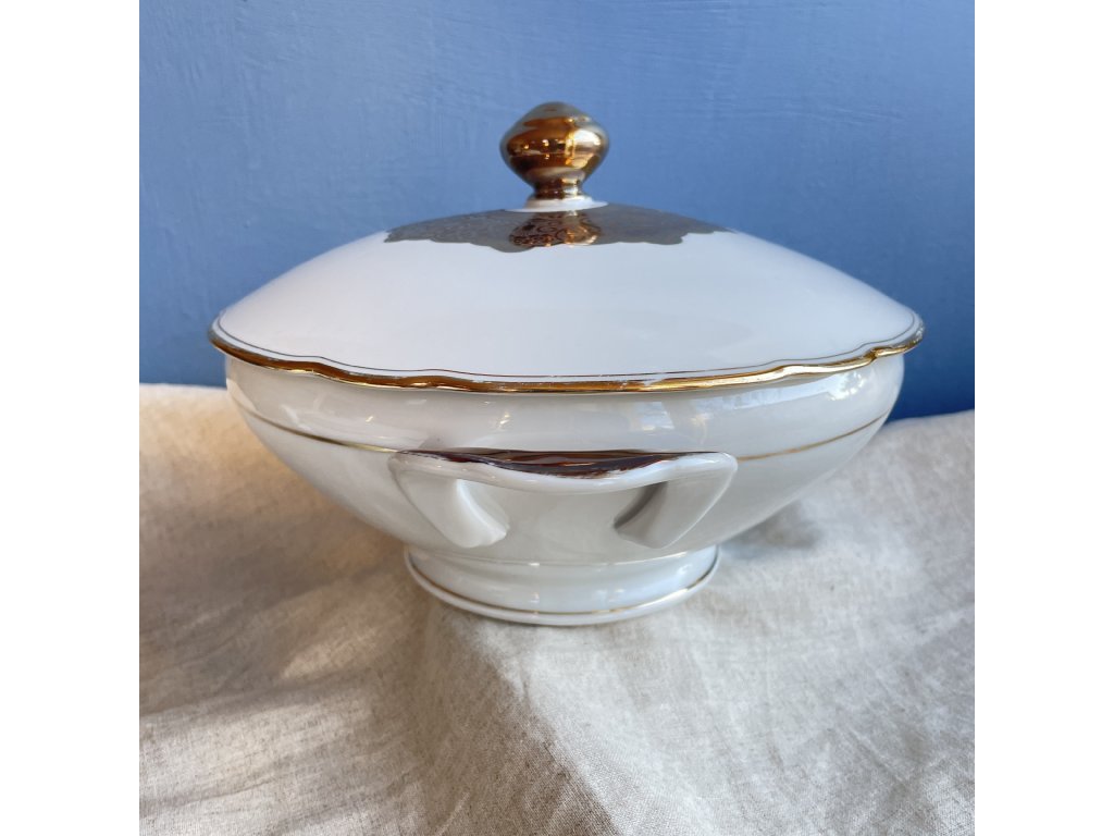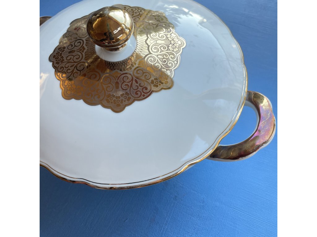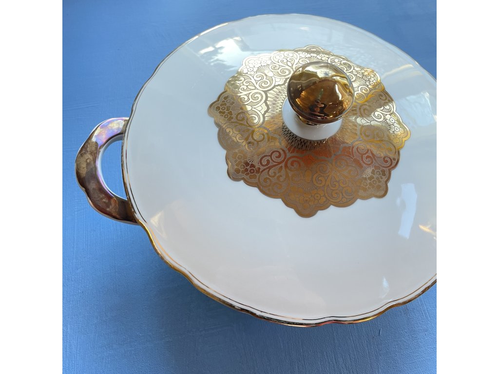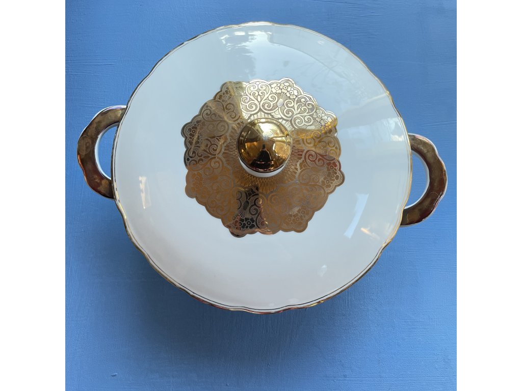 Terina je elegantní a zdobena výraznými zlatými detaily – na víku se nachází bohatý zlatý ornament ve tvaru rozety a také úchyt i okraje mísy jsou zvýrazněny zlacením, což z ní činí dekorativní i slavnostní nádobu.