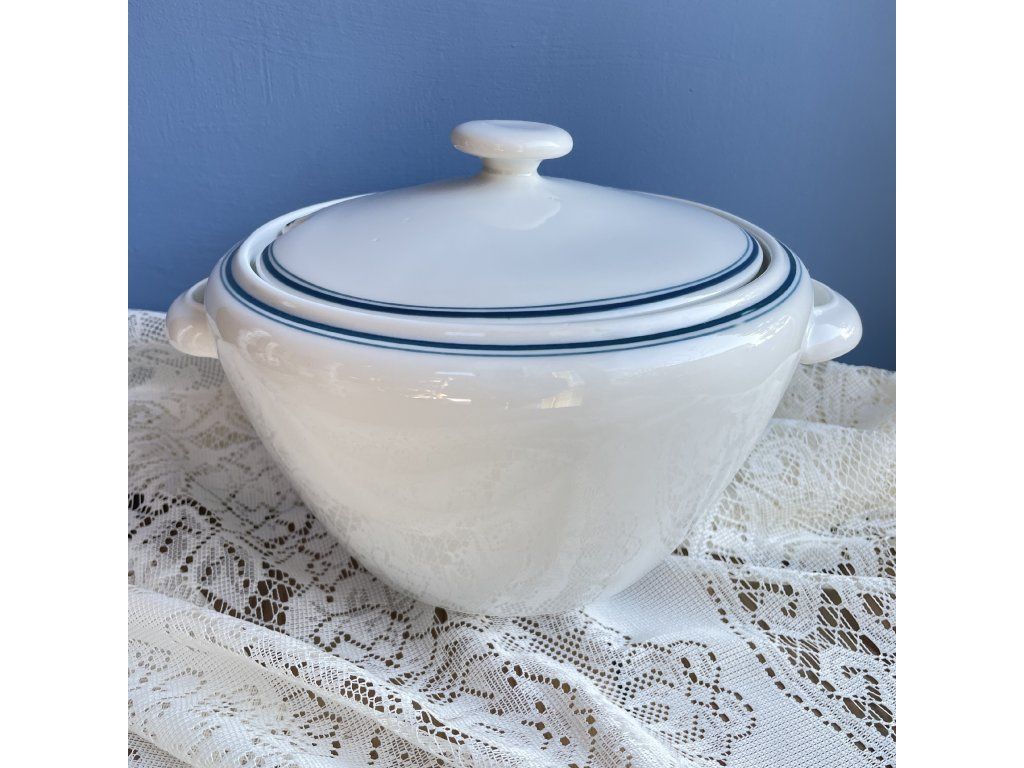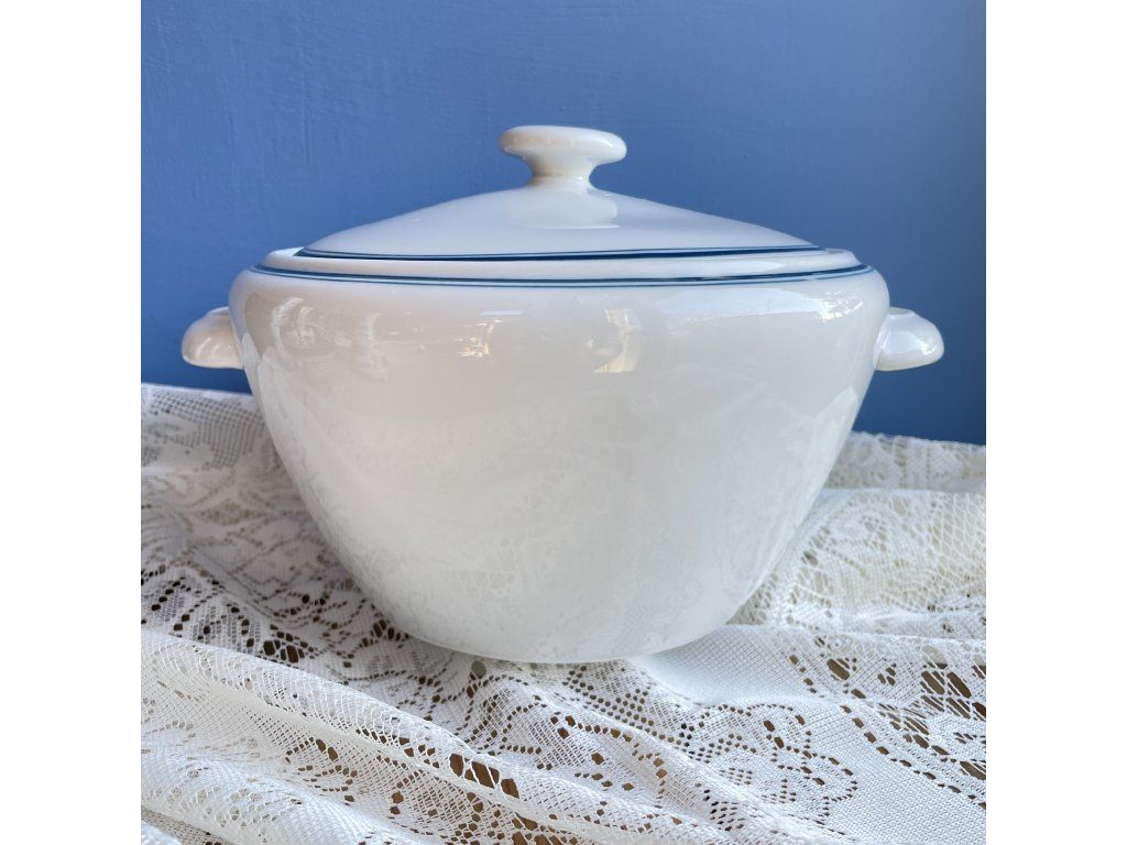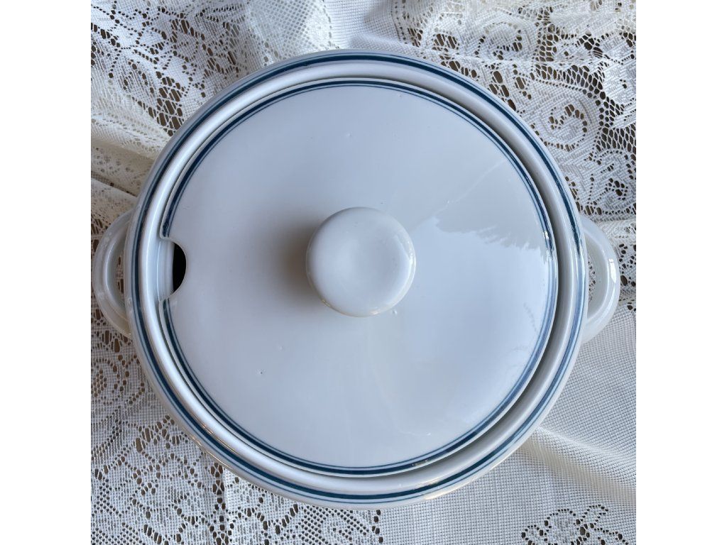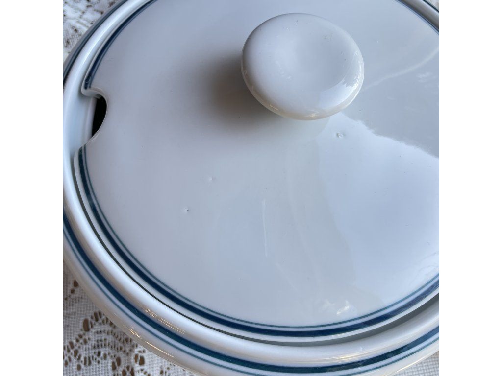 Je vyrobena z kvalitního bílého porcelánu a zdobena jemnou dvojitou linkou v modrozeleném odstínu po obvodu víka i nádoby, což jí dodává decentní, kultivovaný vzhled vhodný jak pro každodenní, tak slavnostní stolování.
