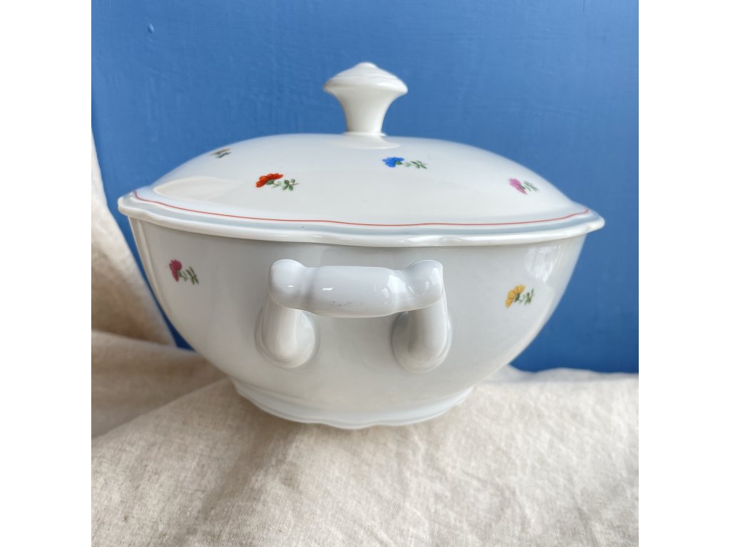 Dekor je tvořen drobnými květinovými motivy v několika barvách, které jsou pravidelně rozmístěny po celém obvodu teriny i na víku.