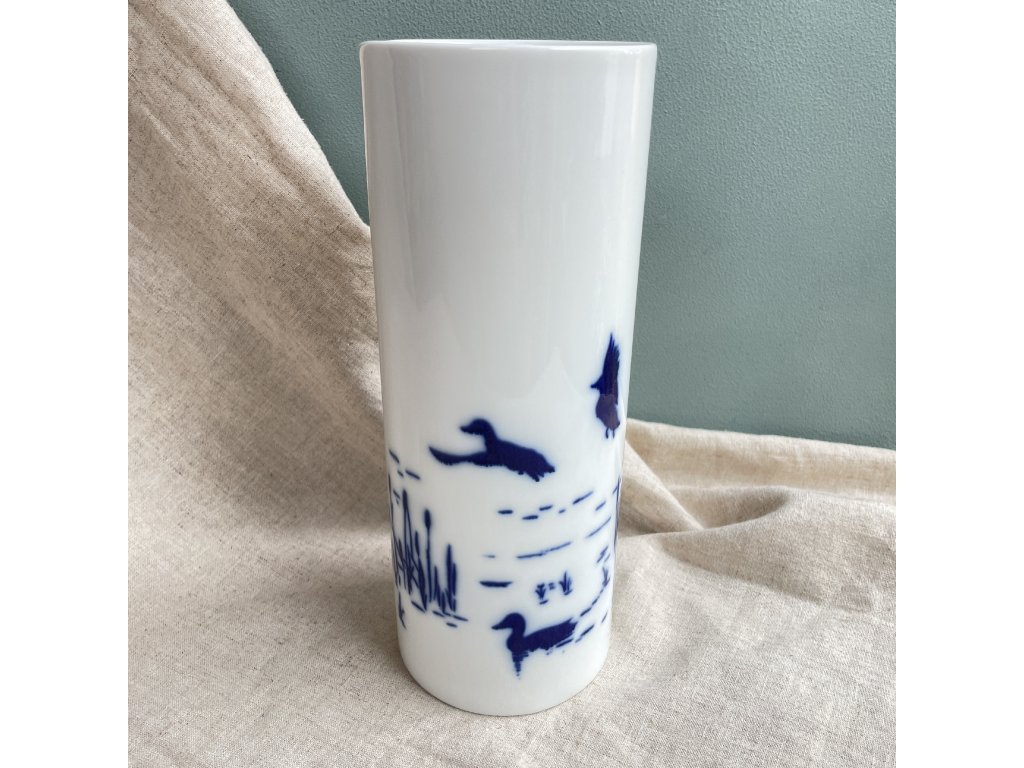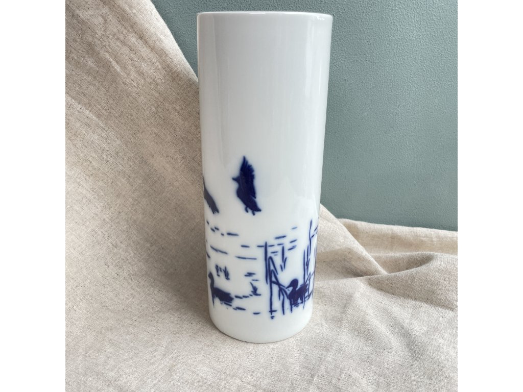 Vysoká porcelánová váza válcovitého tvaru je zdobená kobaltově modrým dekorem s přírodní tematikou.