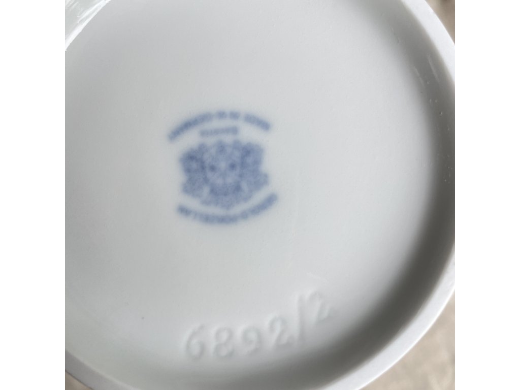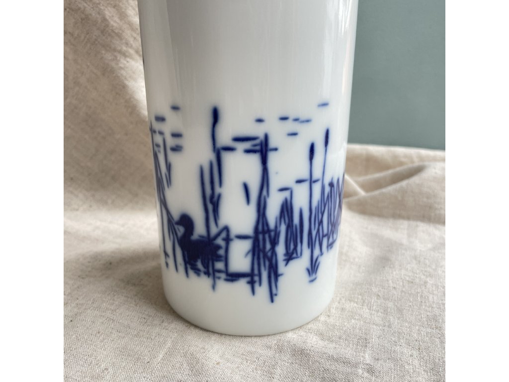 Scéna zachycuje vodní ptactvo v rákosí – kachny na hladině, ptáky v letu i ve vegetaci – a je stylizována v jemné kresbě, která připomíná tradiční podglazurovou modrou malbu používanou na evropském i asijském porcelánu.