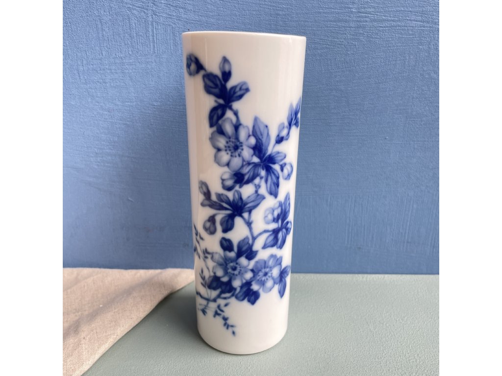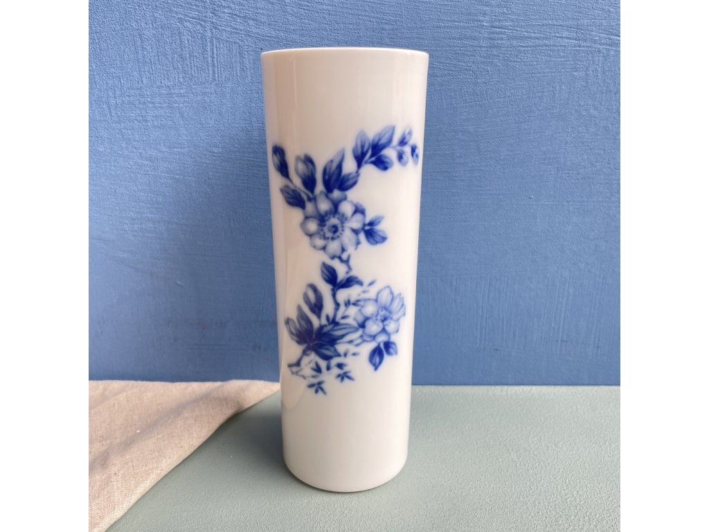 Váza má štíhlý, válcovitý tvar a je dekorována modrobílým květinovým motivem.