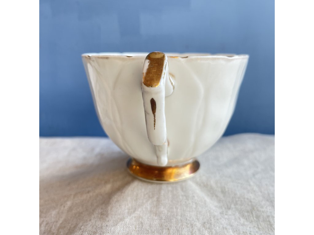 Ucho má elegantně lomený tvar a je ručně dekorováno zlatem, jež nese patrné známky stáří a používání, což podtrhuje autenticitu kusu.