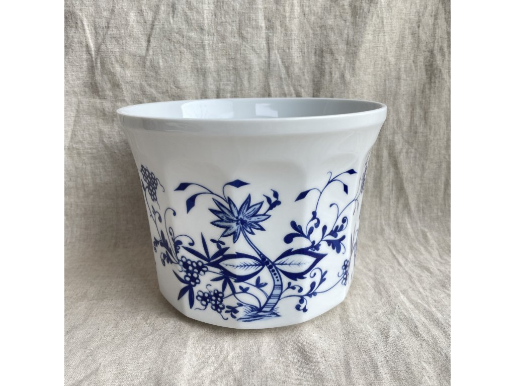 Porcelánový květináč je zdoben tradičním modrobílým dekorem inspirovaným klasickým cibulákovým vzorem.