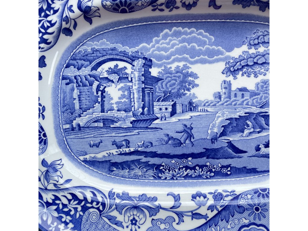 Porcelánový podnos s jemně zvlněným okrajem nese jeden z nejznámějších motivů britské keramiky – takzvaný „Italian“ vzor.