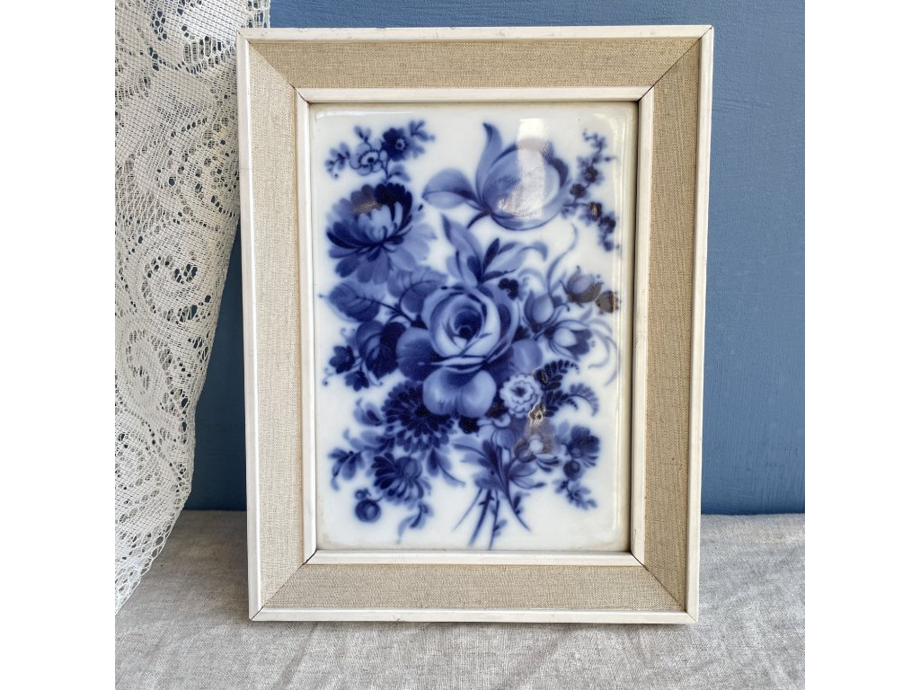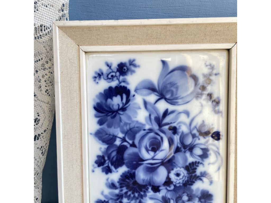 Kachle s jemnou modrobílou květinovou malbou, zasazená do jednoduchého světlého rámu.