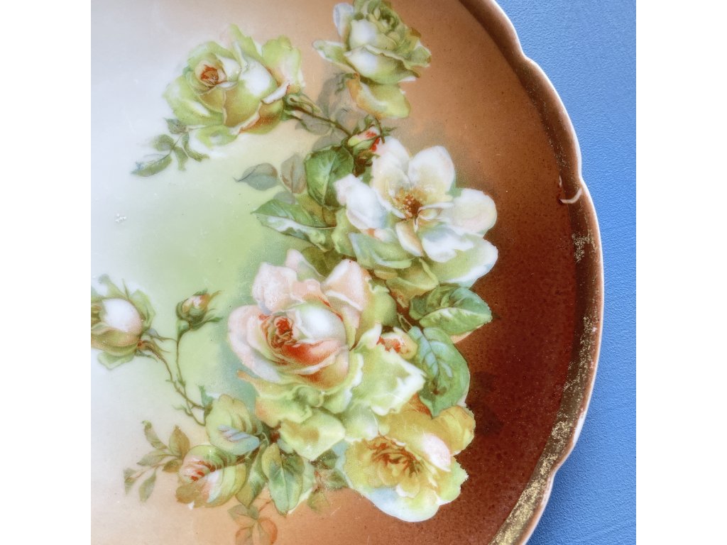 Hlavní dekor tvoří bohatý shluk růží a poupat v odstínech světle zelené, krémové, jemně žluté a lososově růžové.