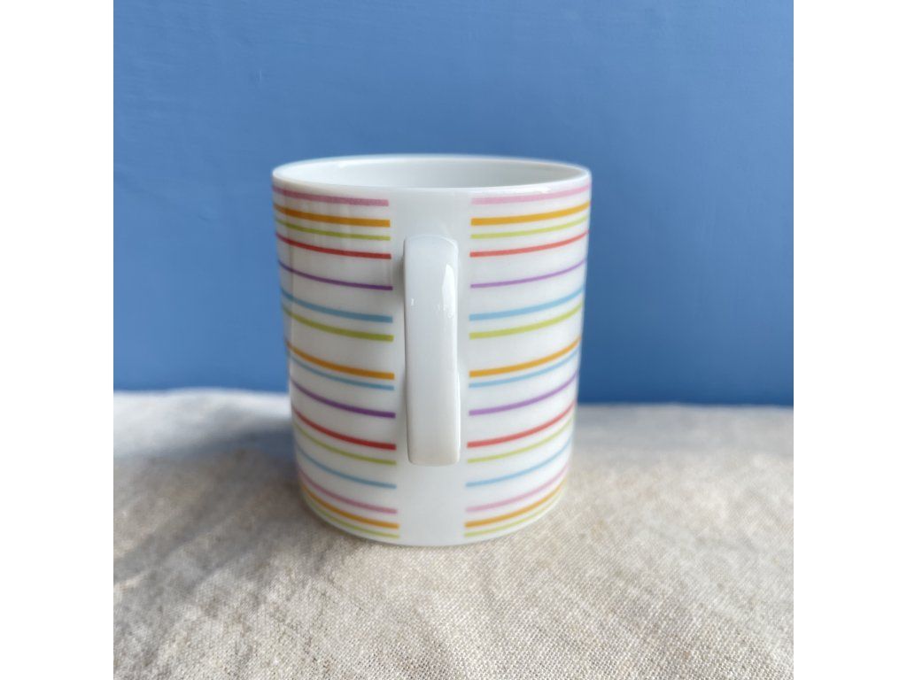 Dekor tvoří pravidelné horizontální proužky v pestré kombinaci barev – růžové, žluté, zelené, modré a fialové – na bílém podkladu.