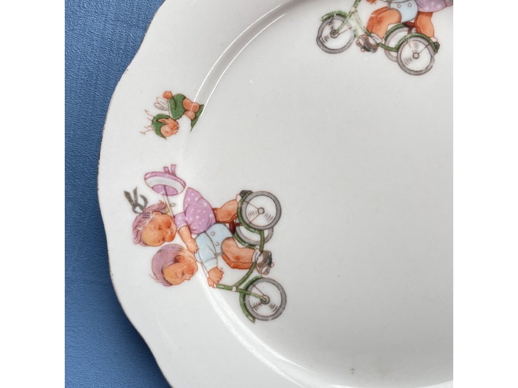 Po obvodu talíře je rozprostřen opakující se dětský motiv – dvojice drobných postaviček jedoucích na tříkolce, provedená v měkkých pastelových barvách.