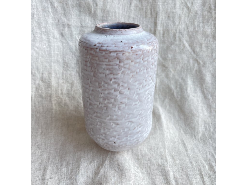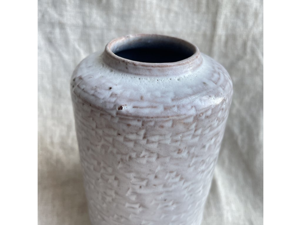 Povrch je nepravidelně strukturovaný, glazura není zcela homogenní, místy prosvítá teplejší odstín podkladu a drobné tmavší tečky, což dodává vázičce autentický, ručně vyráběný charakter.