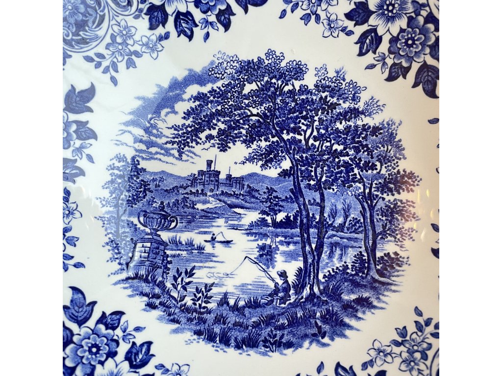 Ve středu mísy se nachází klidná krajinná kompozice s vodní hladinou, rybářem, stromy a vzdálenou architekturou, která evokuje romantickou představu anglického venkova.