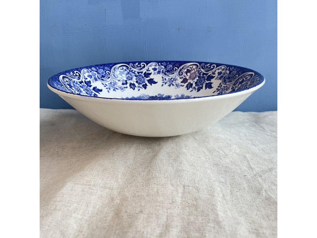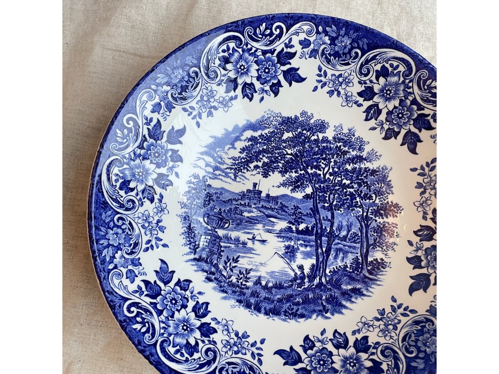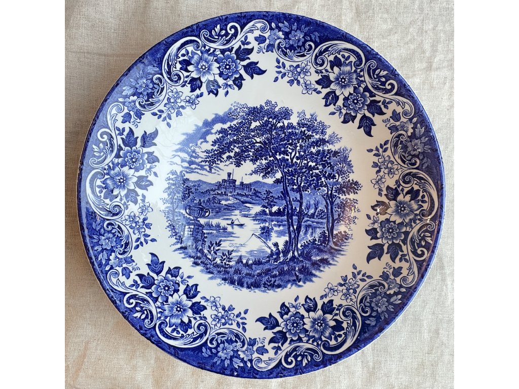 Široká servírovací mísa je vyrobena z anglické kameniny typu ironstone a zdobena klasickým modrobílým transferovým dekorem English Scene.