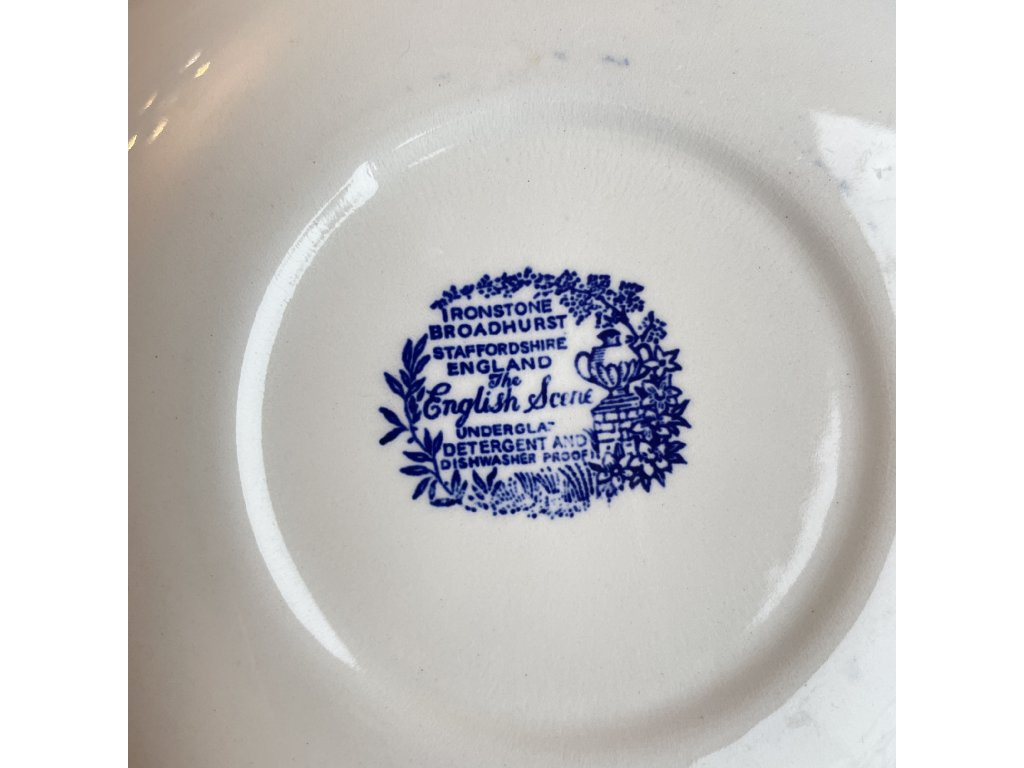 Na spodní straně je značka Ironstone Broadhurst, Staffordshire, England – The English Scene, doplněná informací o podglazurním dekoru, který je odolný vůči detergentům a vhodný i do myčky.