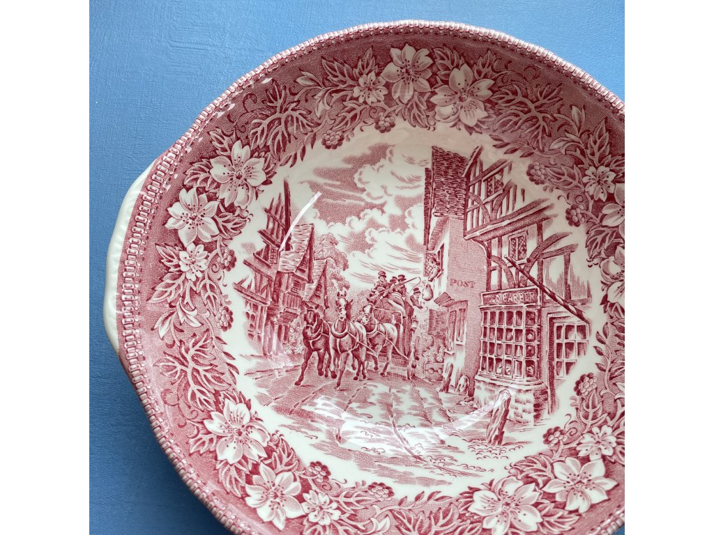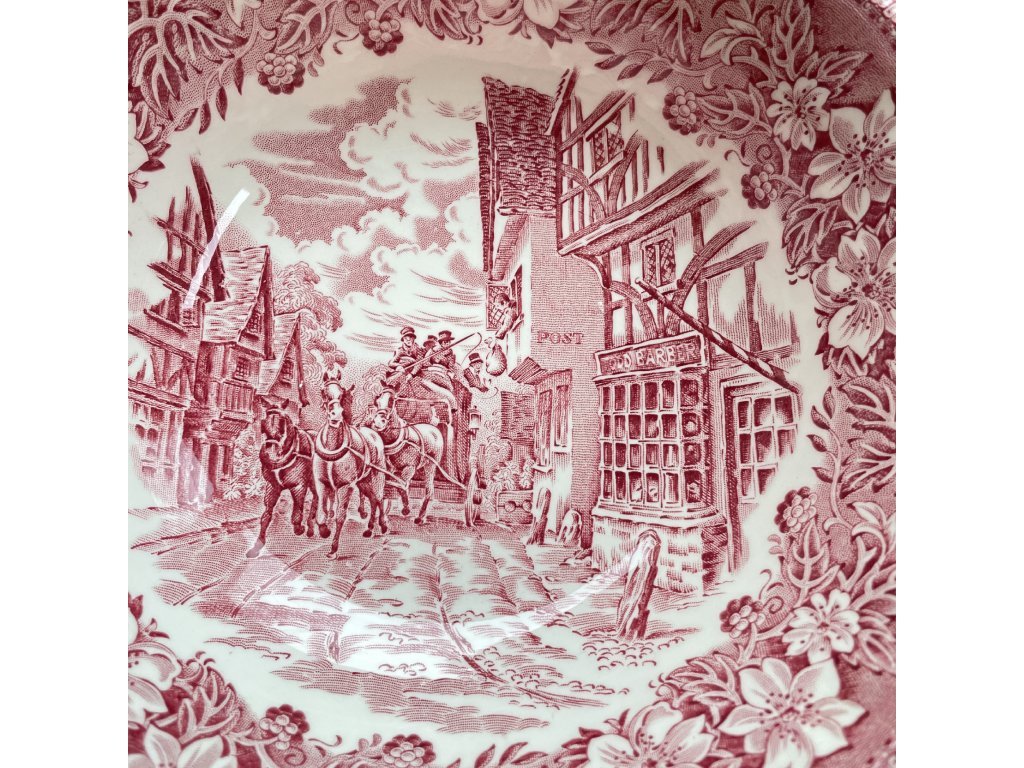 Salátová mísa z anglické kameniny s výrazným červeným transferovým dekorem, který je typický pro anglickou keramickou produkci inspirovanou historickými motivy.