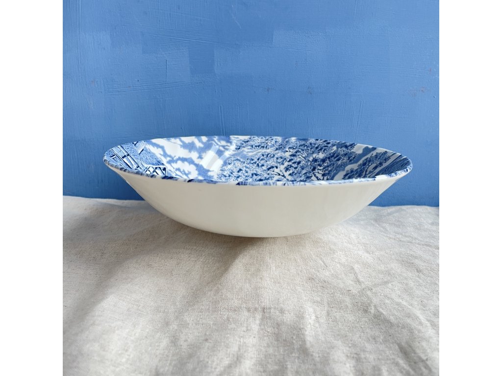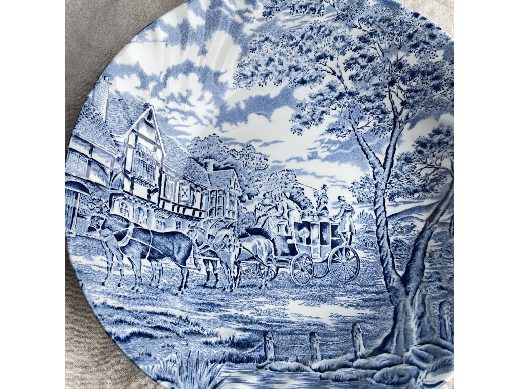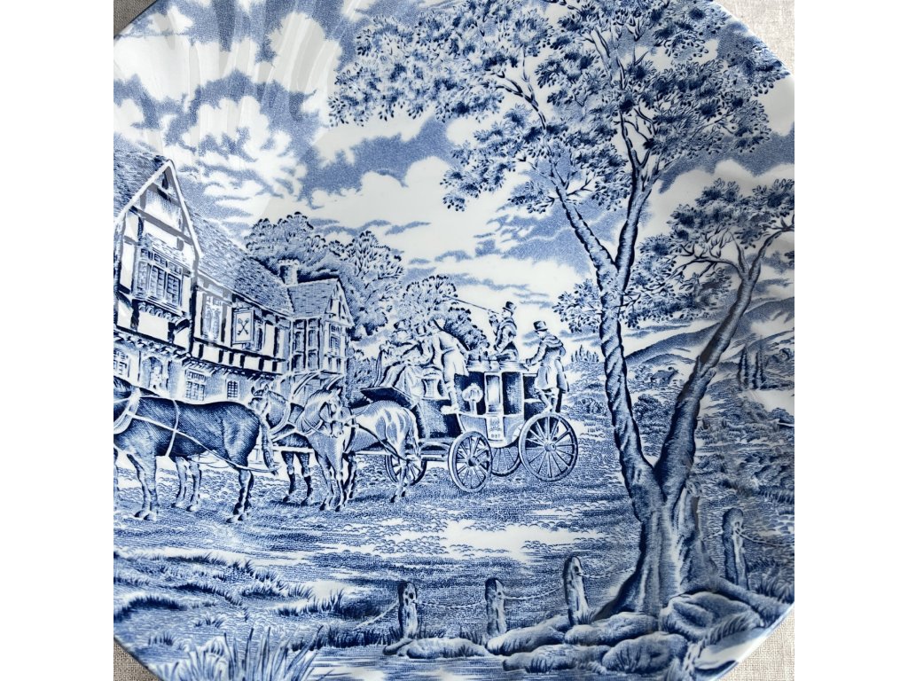 Kameninová mísa je zdobena klasickým modrobílým transferovým dekorem s romantickou venkovskou scénou, v níž se prolíná krajina s domy, koňský povoz a postavy v dobovém oblečení, typické pro anglickou tradici inspirovanou 18. a 19. stoletím.