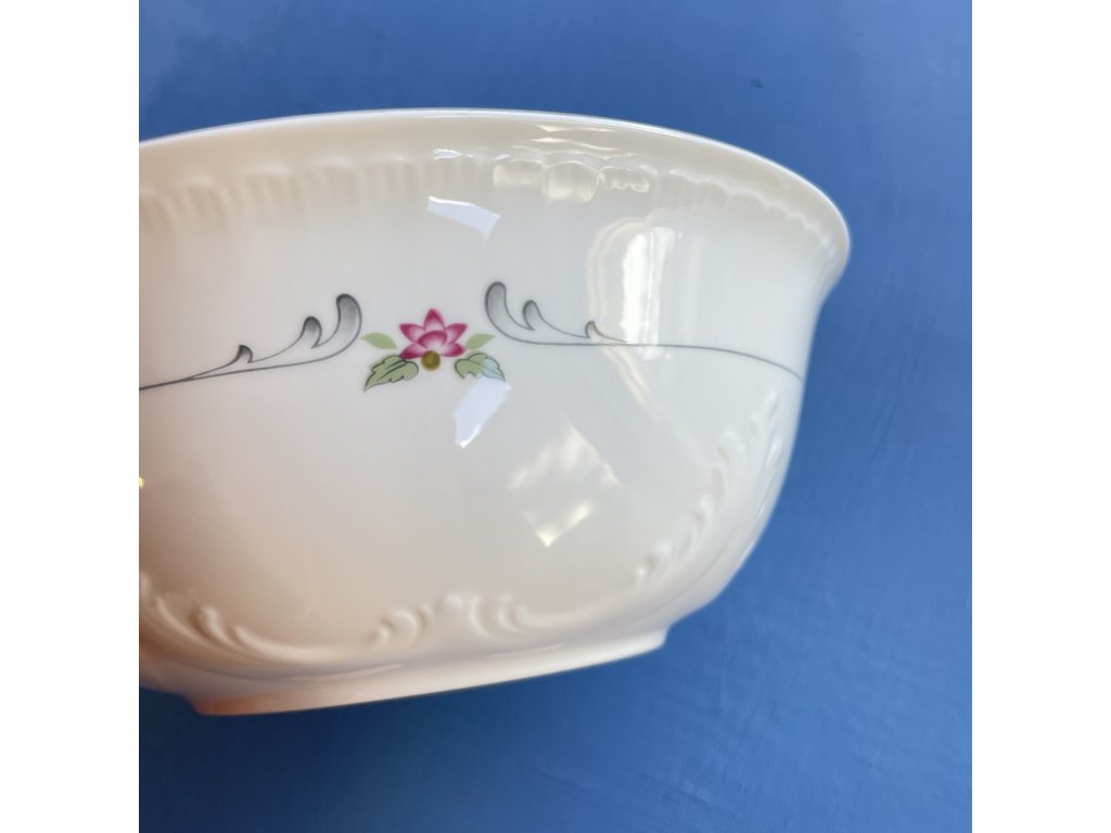 Dekor je laděn do tlumených, harmonických tónů – tenká šedá linka obíhá po obvodu a je doplněna drobnými stylizovanými ornamenty a jemným květinovým motivem v růžové barvě se zelenými lístky.