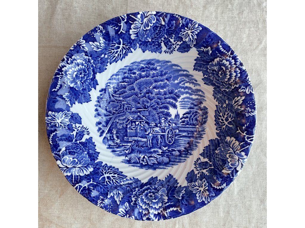 Mísa z anglické kameniny je zdobena výrazným modrobílým transferovým dekorem s názvem English Scenery.