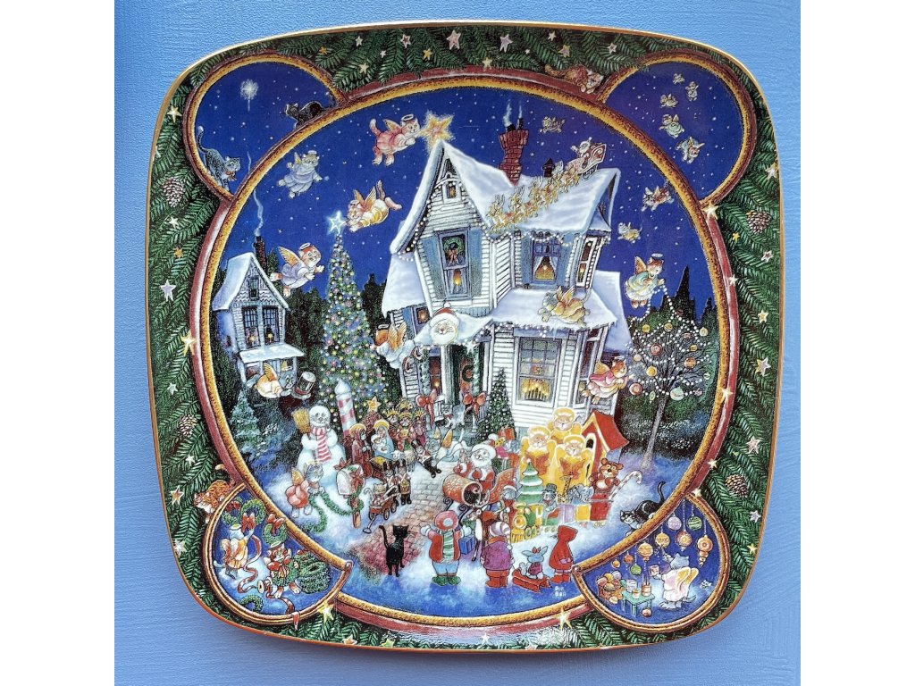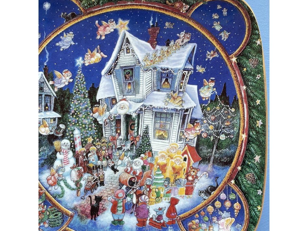 Scéna na talíři je bohatě ilustrovaná vánočním motivem – zasněžený dům s množstvím andělských koček, Santou Clausem a dalšími postavami oslavujícími sváteční večer.