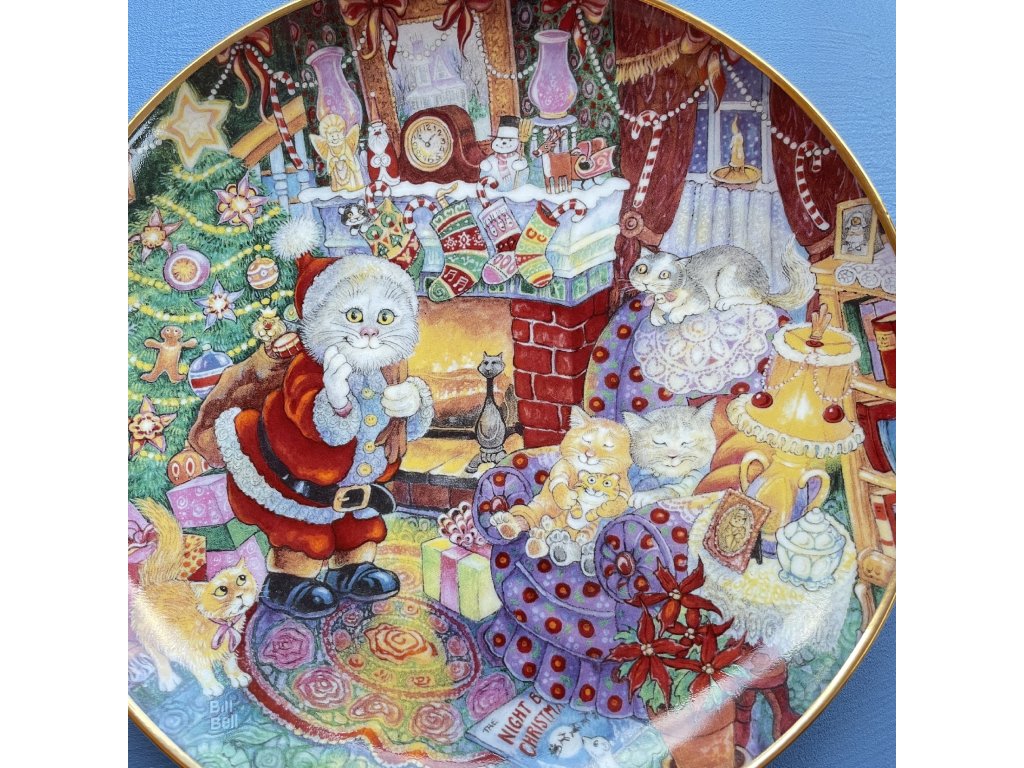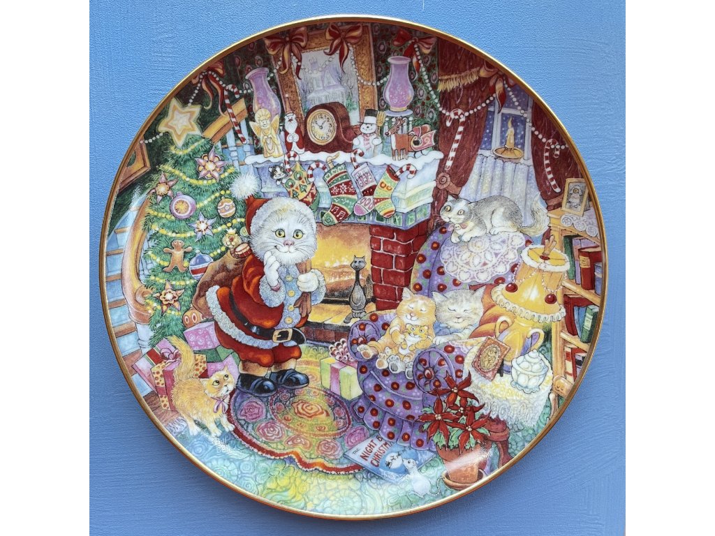 Talíř zachycuje poklidnou vánoční scénu s roztomilými kočkami v hlavních rolích – jedna z nich, převlečená za Santa Clause, právě vstupuje do útulného obývacího pokoje se zapáleným krbem, ozdobeným vánočním stromkem a spícími koťaty.
