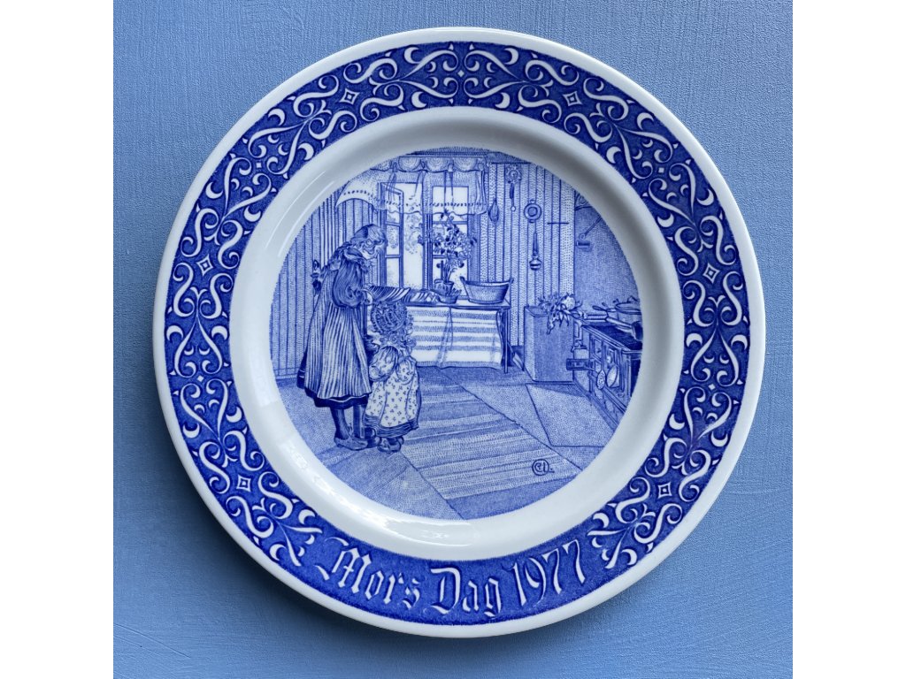Okraj talíře je zdoben bohatým ornamentálním dekorem s proplétanými rostlinnými motivy, do něhož je zakomponován nápis „Mors Dag 1977“, tedy Den matek 1977, což jasně určuje pamětní charakter tohoto kusu.